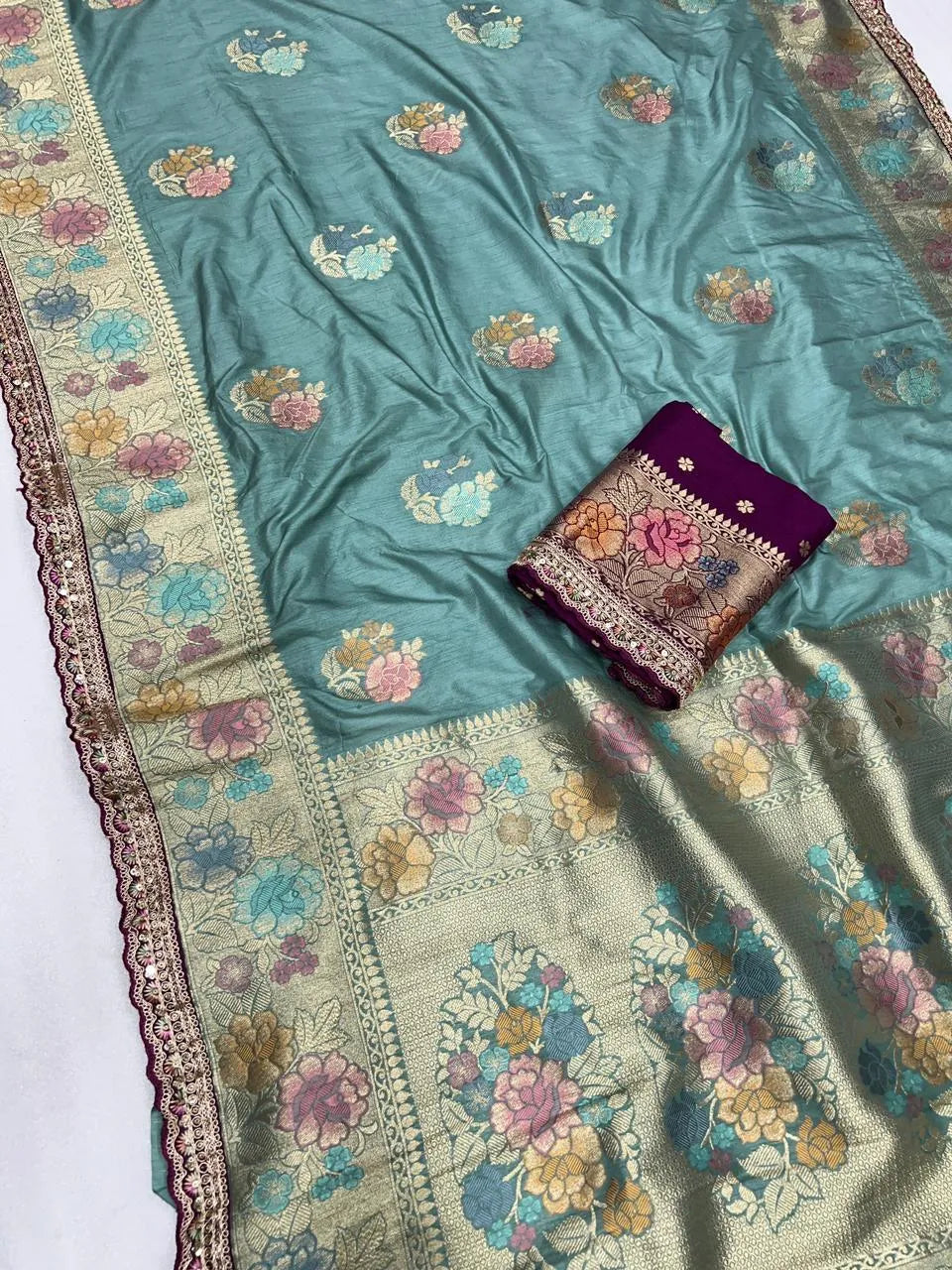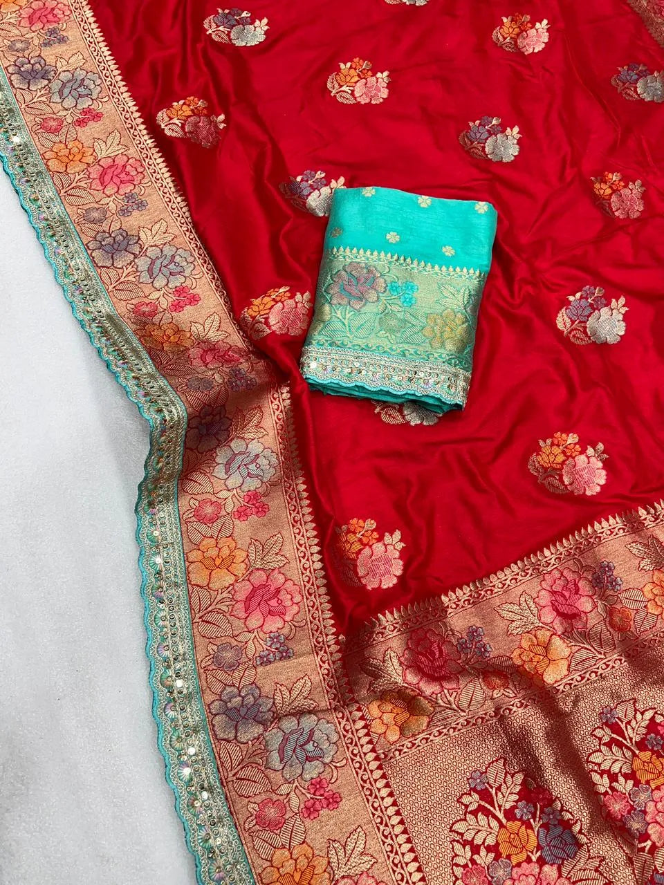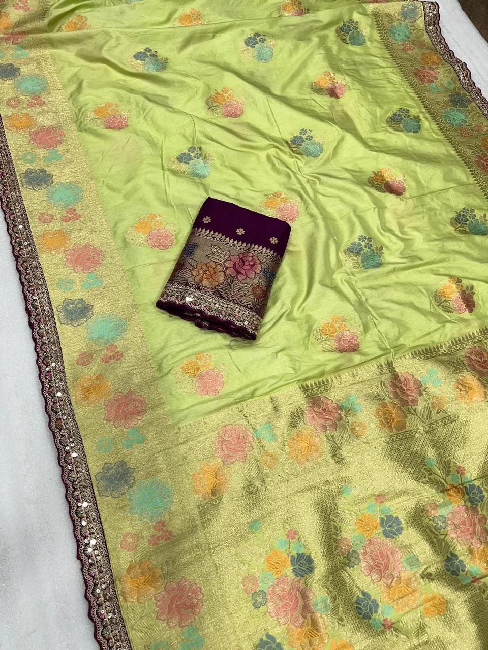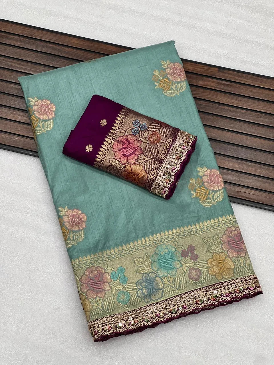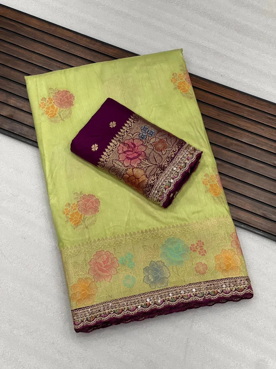 Elevate your festive look with this elegant Dola Silk saree featuring a rich Banarasi lace border. Crafted in soft and flowy fabric, this saree offers a graceful drape with a luxurious finish. The beautifully designed border adds a traditional touch, making it perfect for weddings, festivals, and special occasions.