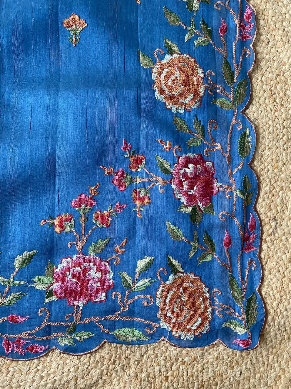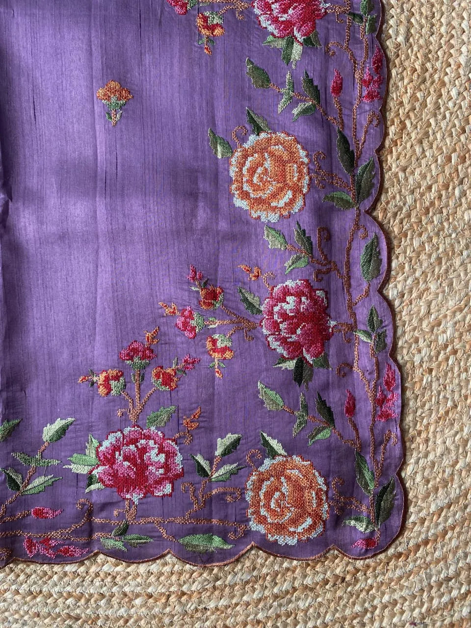 Elegant Matka silk saree featuring a rich textured body that reflects natural silk charm. Highlighted with an exquisite multicolour floral embroidered border with a graceful scalloped edge, adding a handcrafted and luxurious appeal. Soft, lightweight, and easy to drape—perfect for festive occasions, intimate celebrations, and elegant day wear.