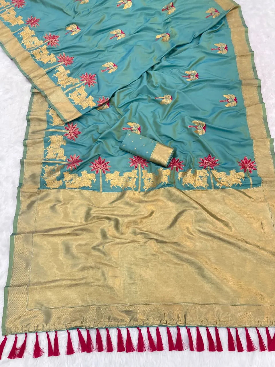 It is paired with a brocade running blouse (same as shown in video), perfectly matching the saree and enhancing its ethnic charm.