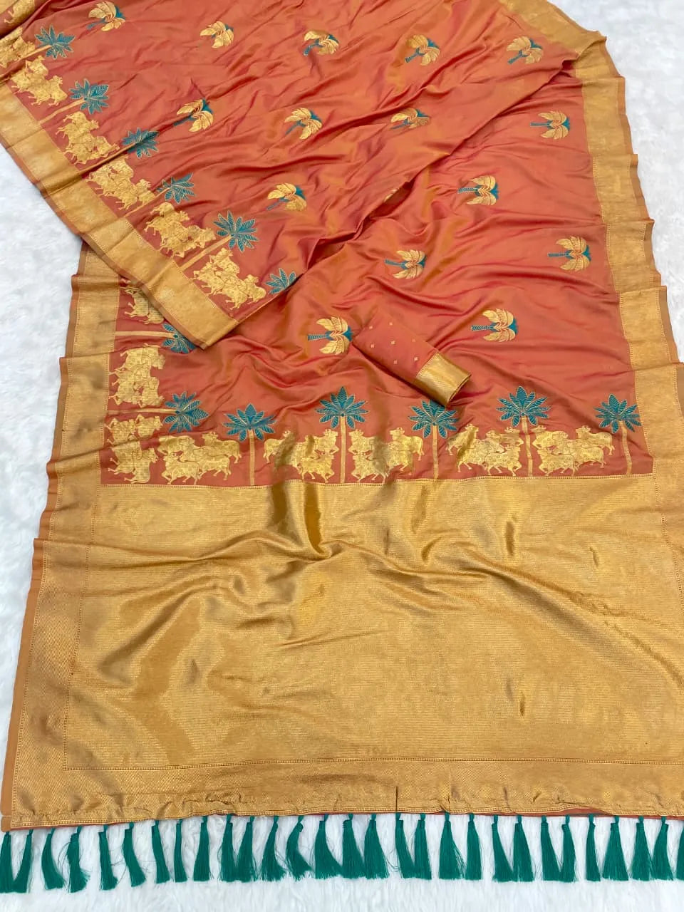 Presenting an exclusive collection of soft silk sarees, designed with traditional flower meenakari motifs all over the body for a rich Pichwai-inspired look. The saree features a rich woven zari pallu and a unique Kamdhenu pattern on the lower part of the border, finished with a 4-inch zari woven border for a grand traditional appeal.
