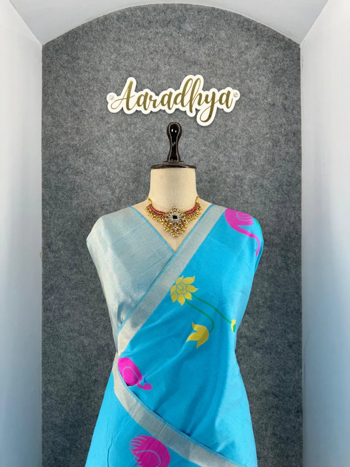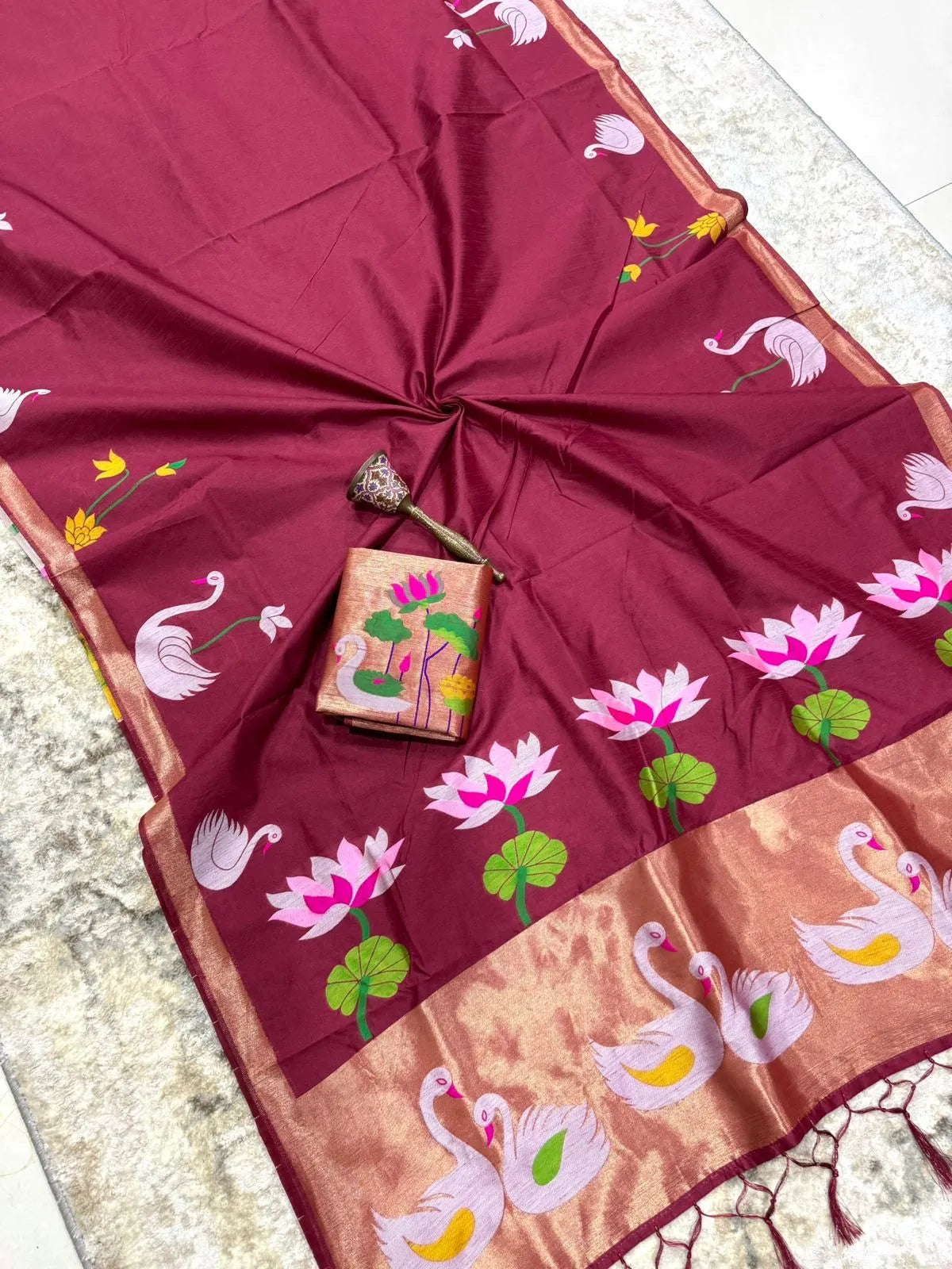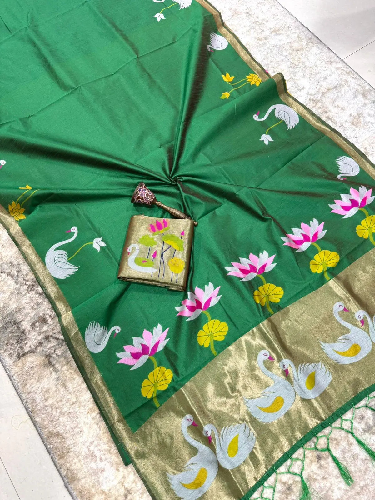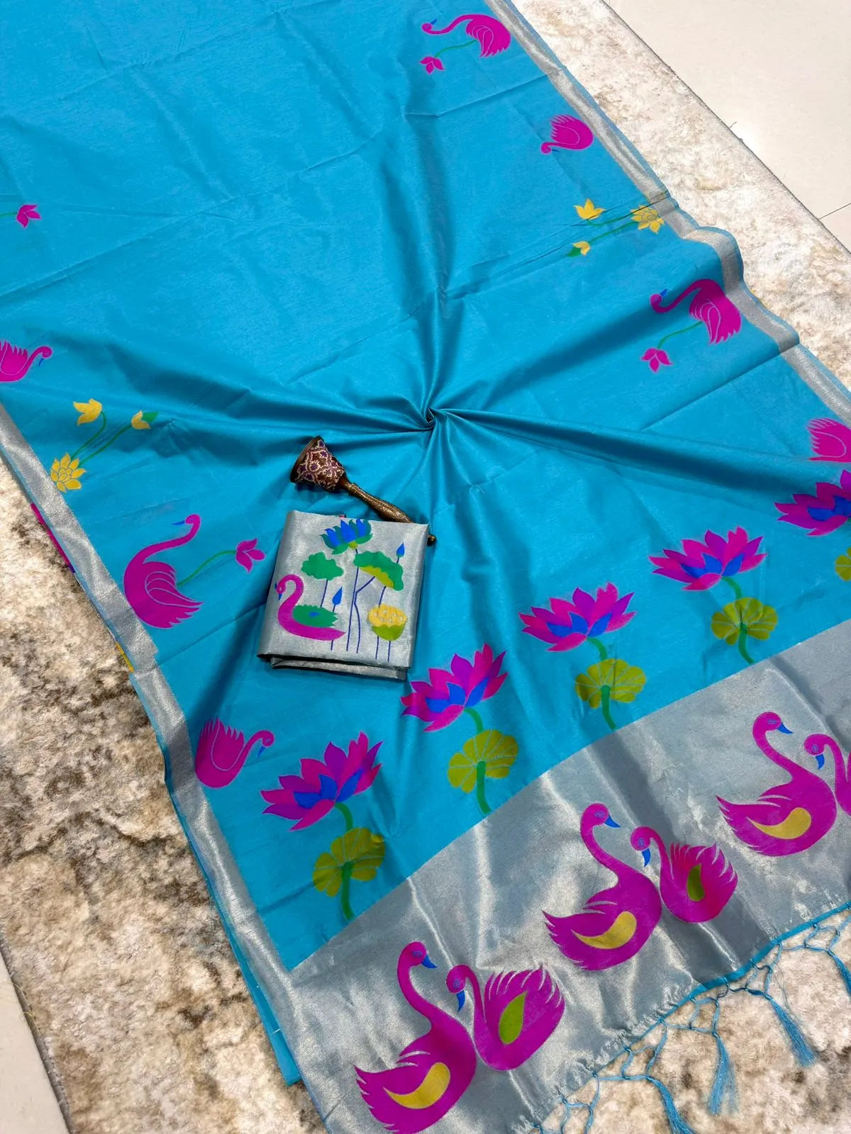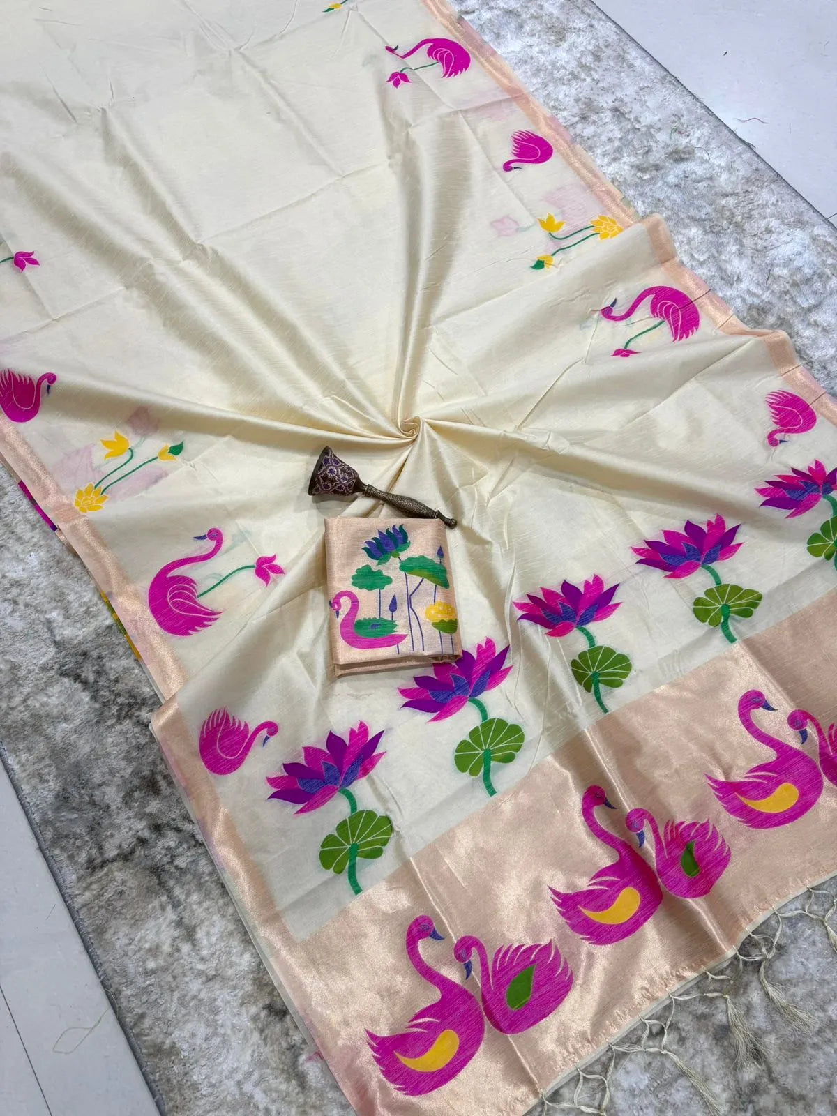 The saree is paired with a contrast brocade (Brocade) blouse, adding a luxurious finish to the overall look.