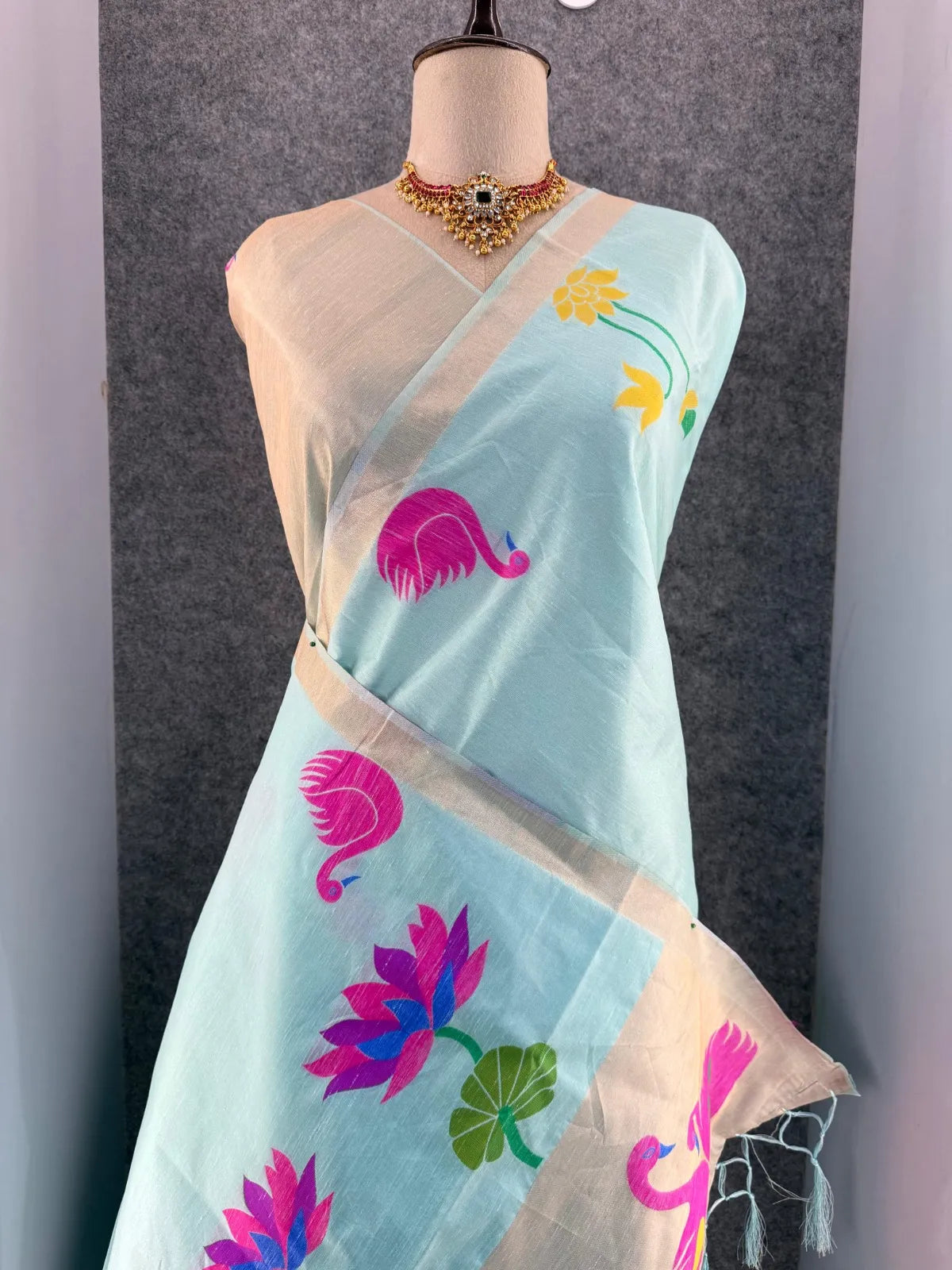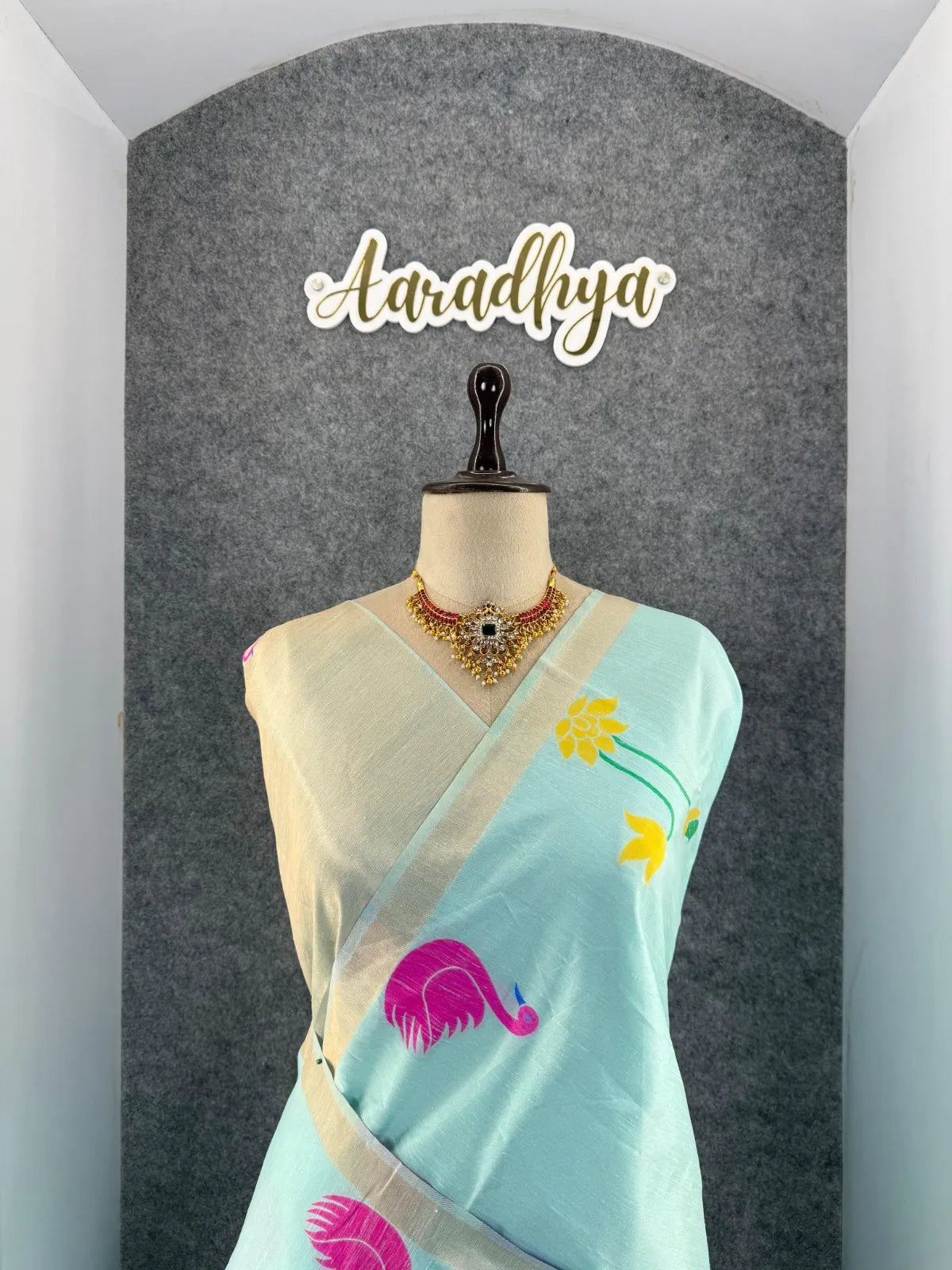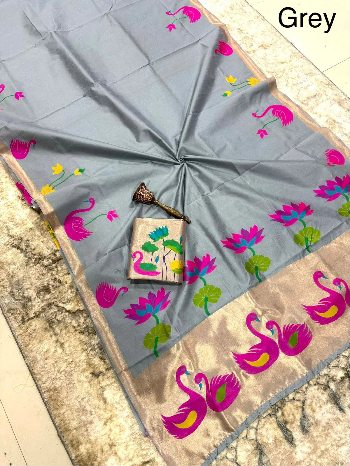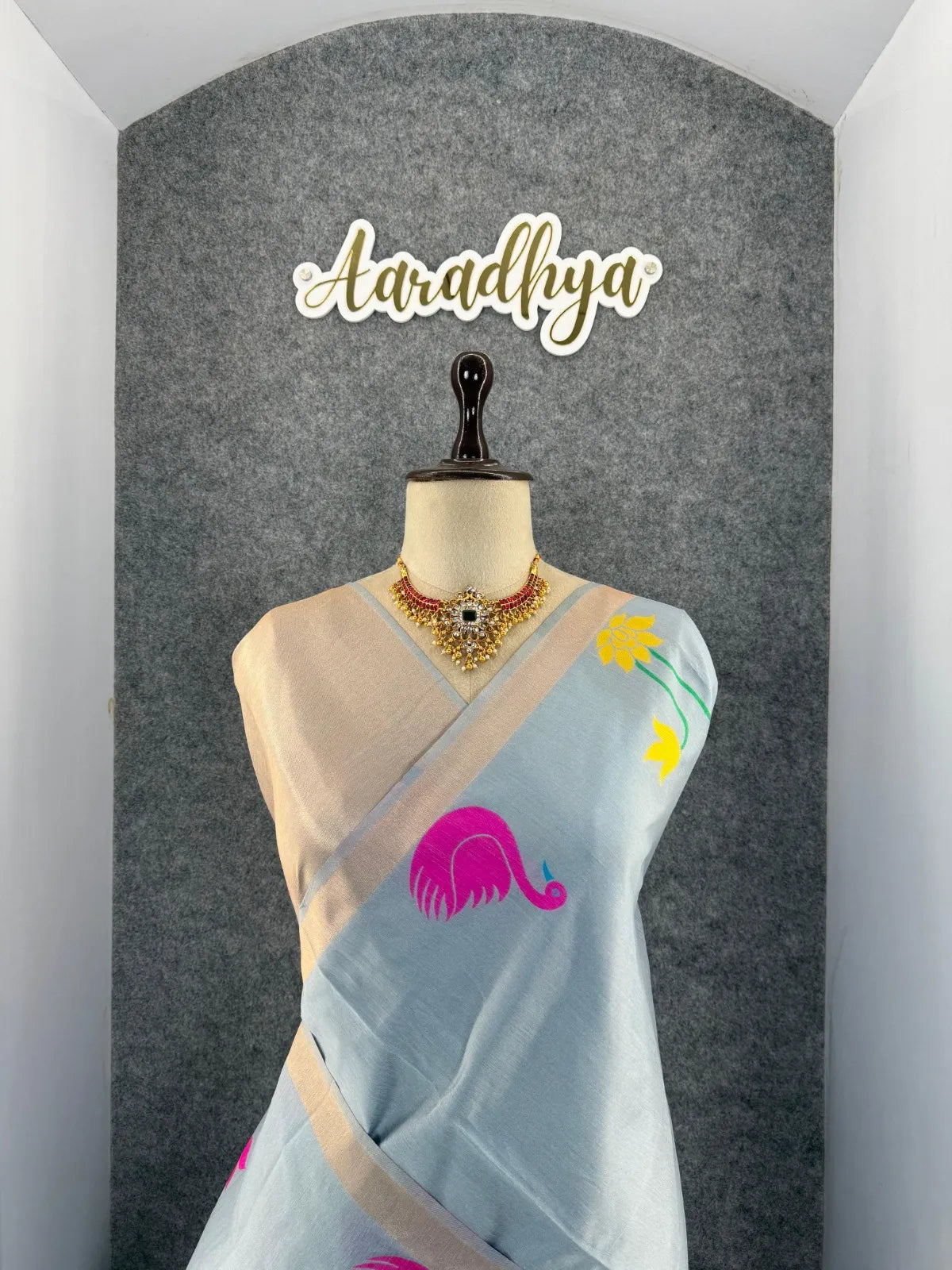 The saree is paired with a contrast brocade (Brocade) blouse, adding a luxurious finish to the overall look.