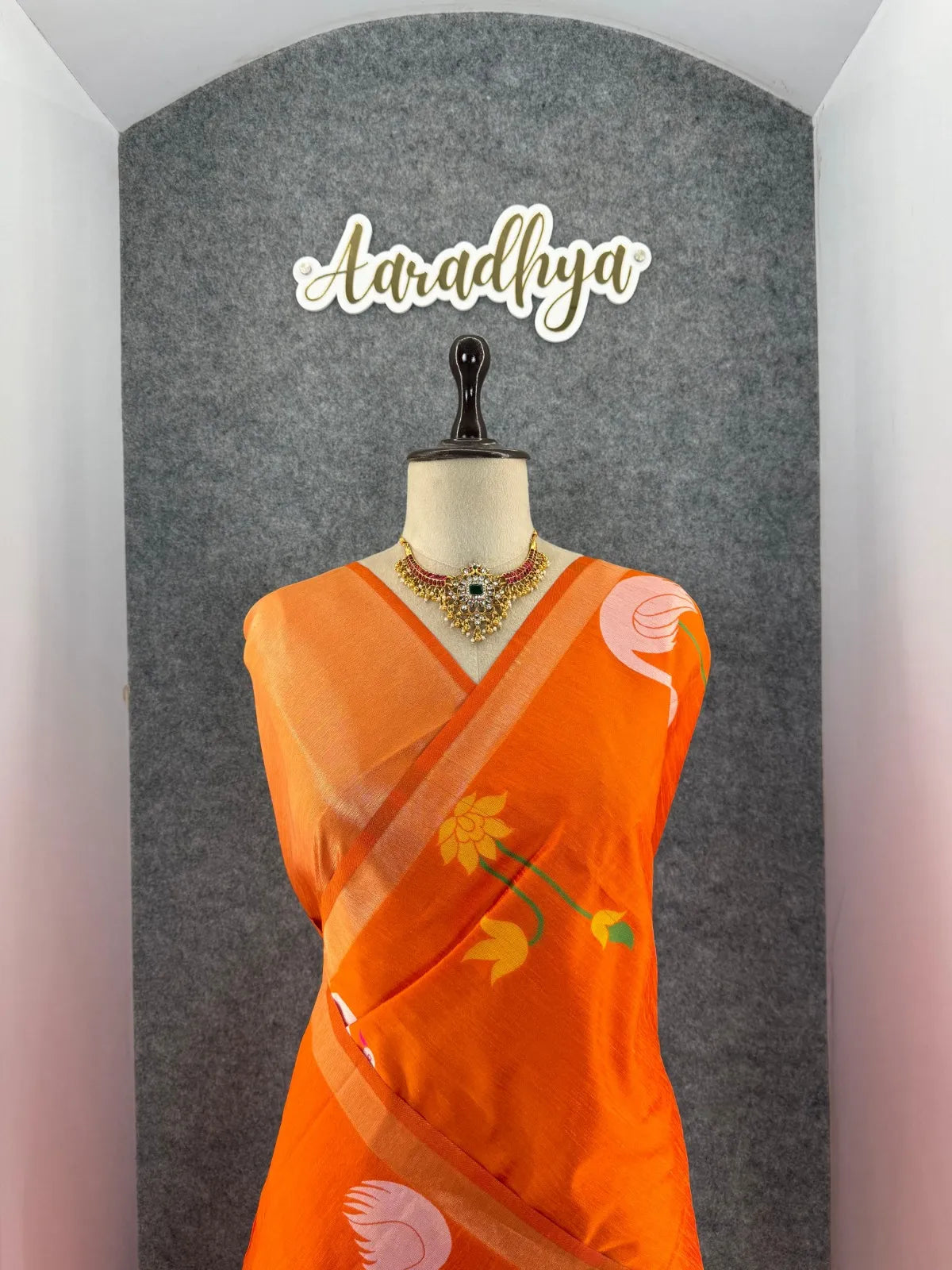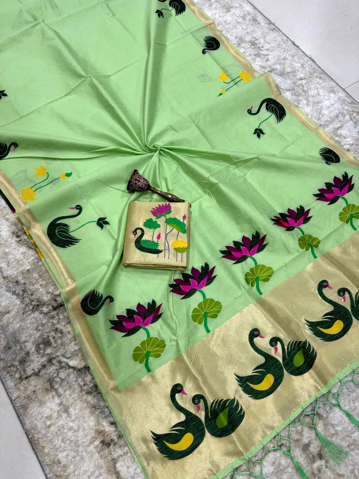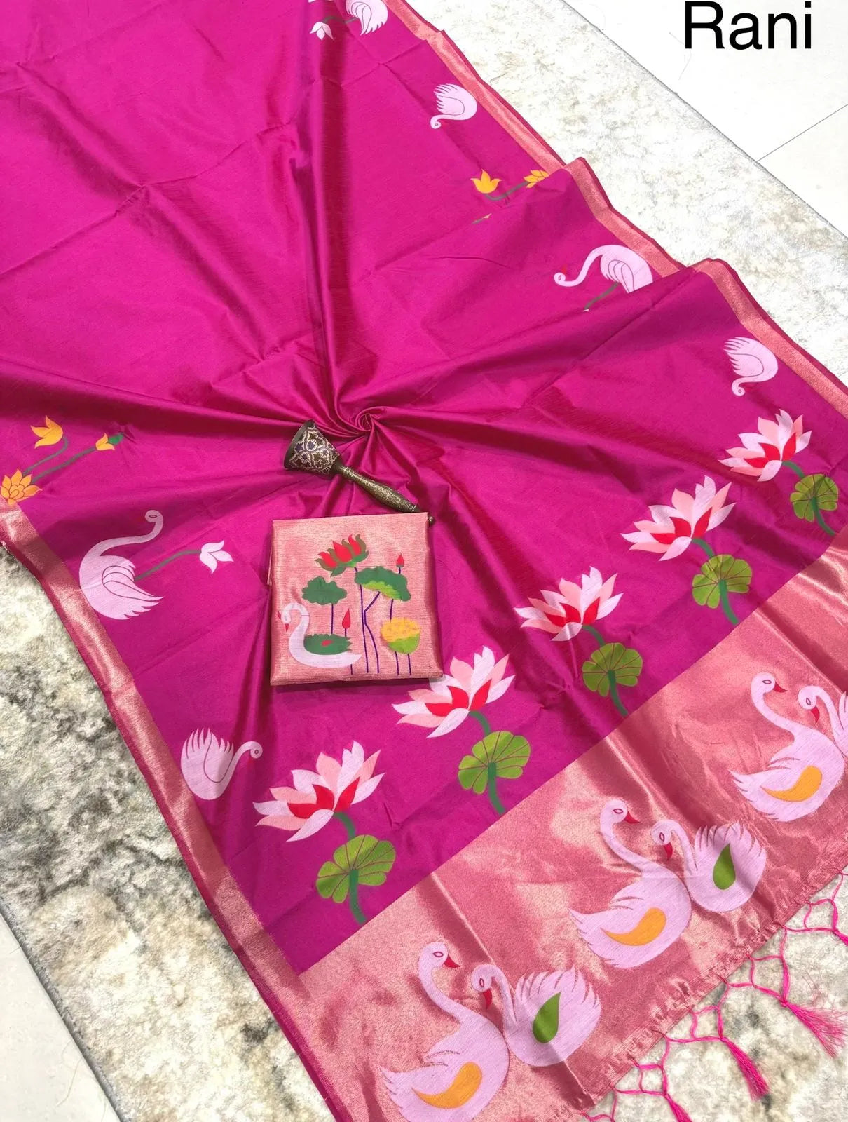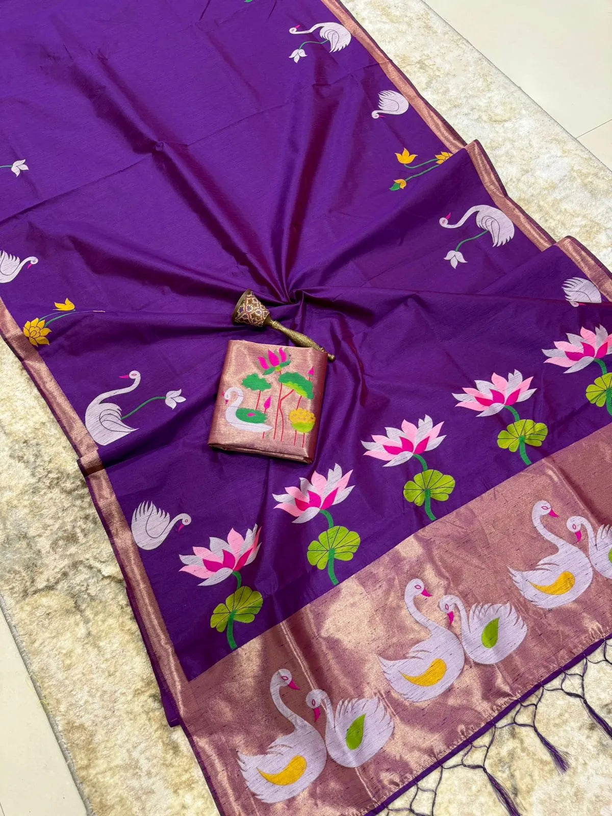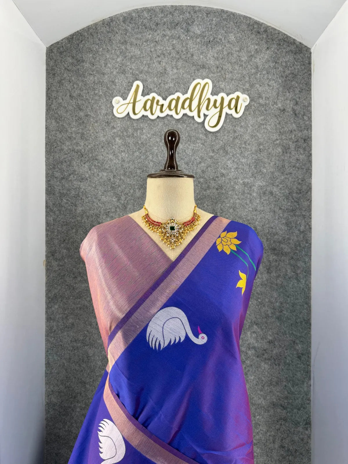 The saree is paired with a contrast brocade (Brocade) blouse, adding a luxurious finish to the overall look.