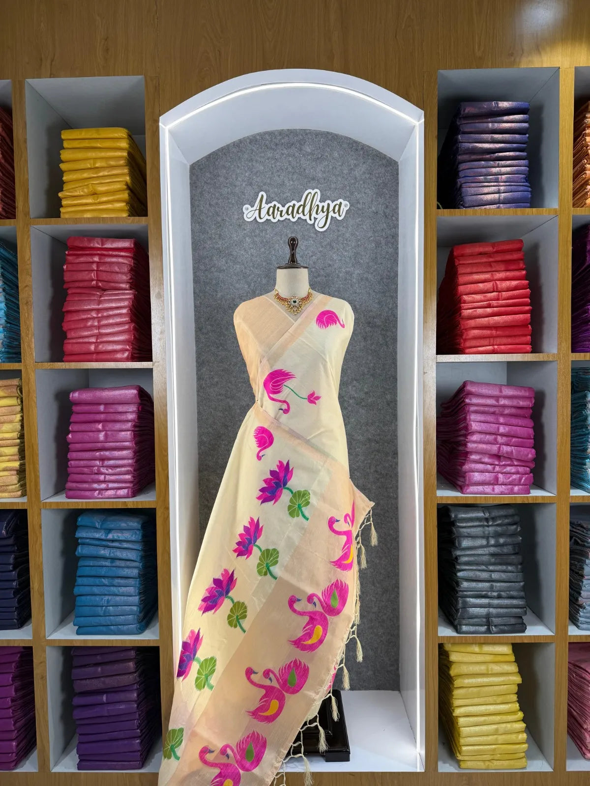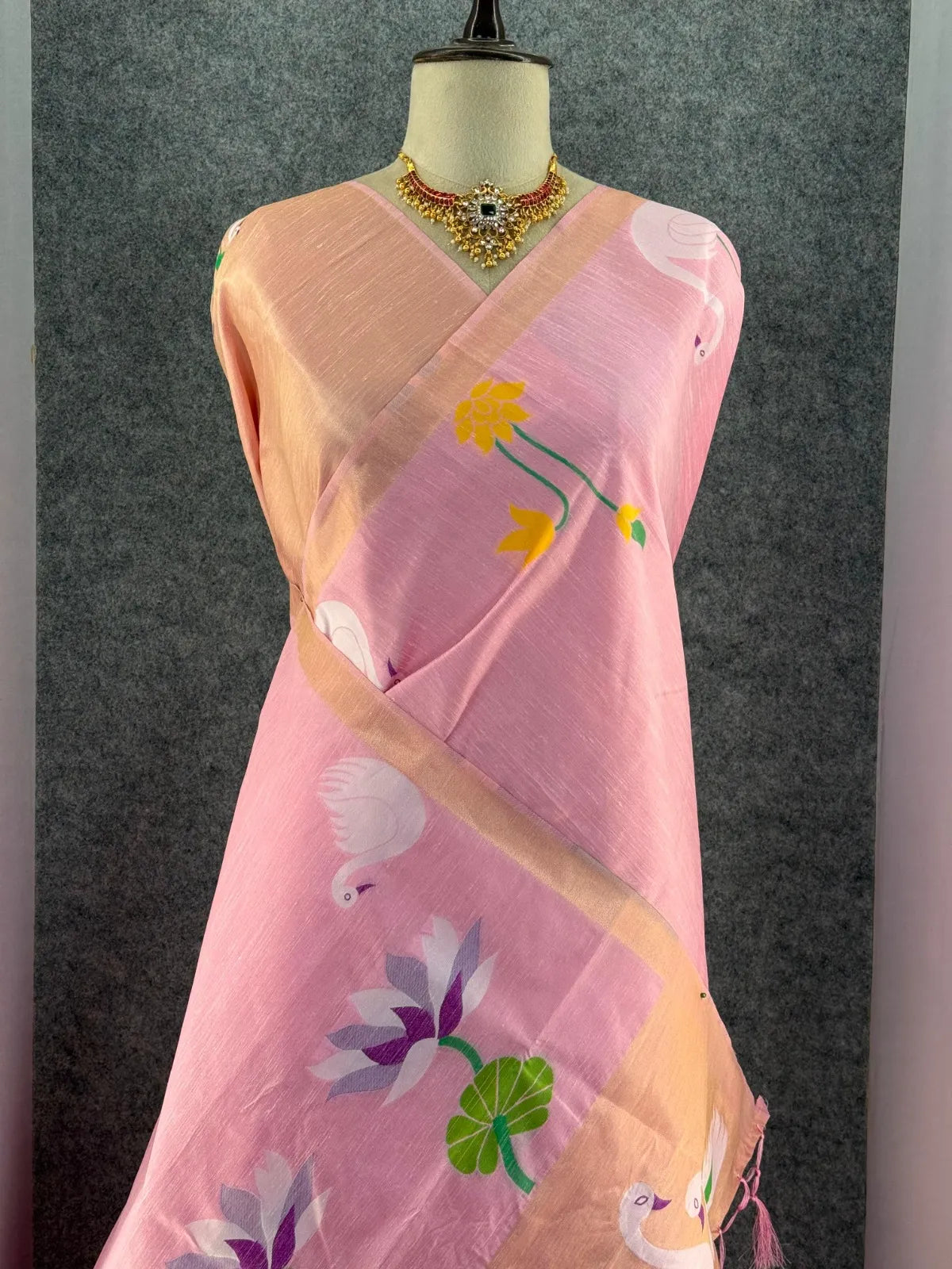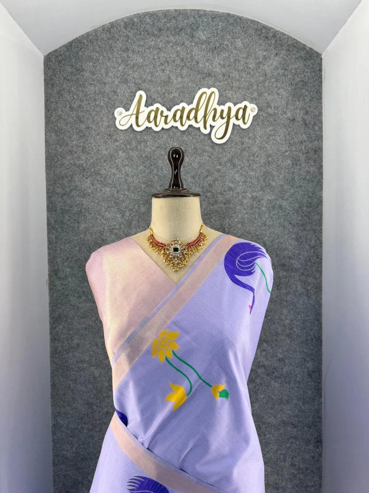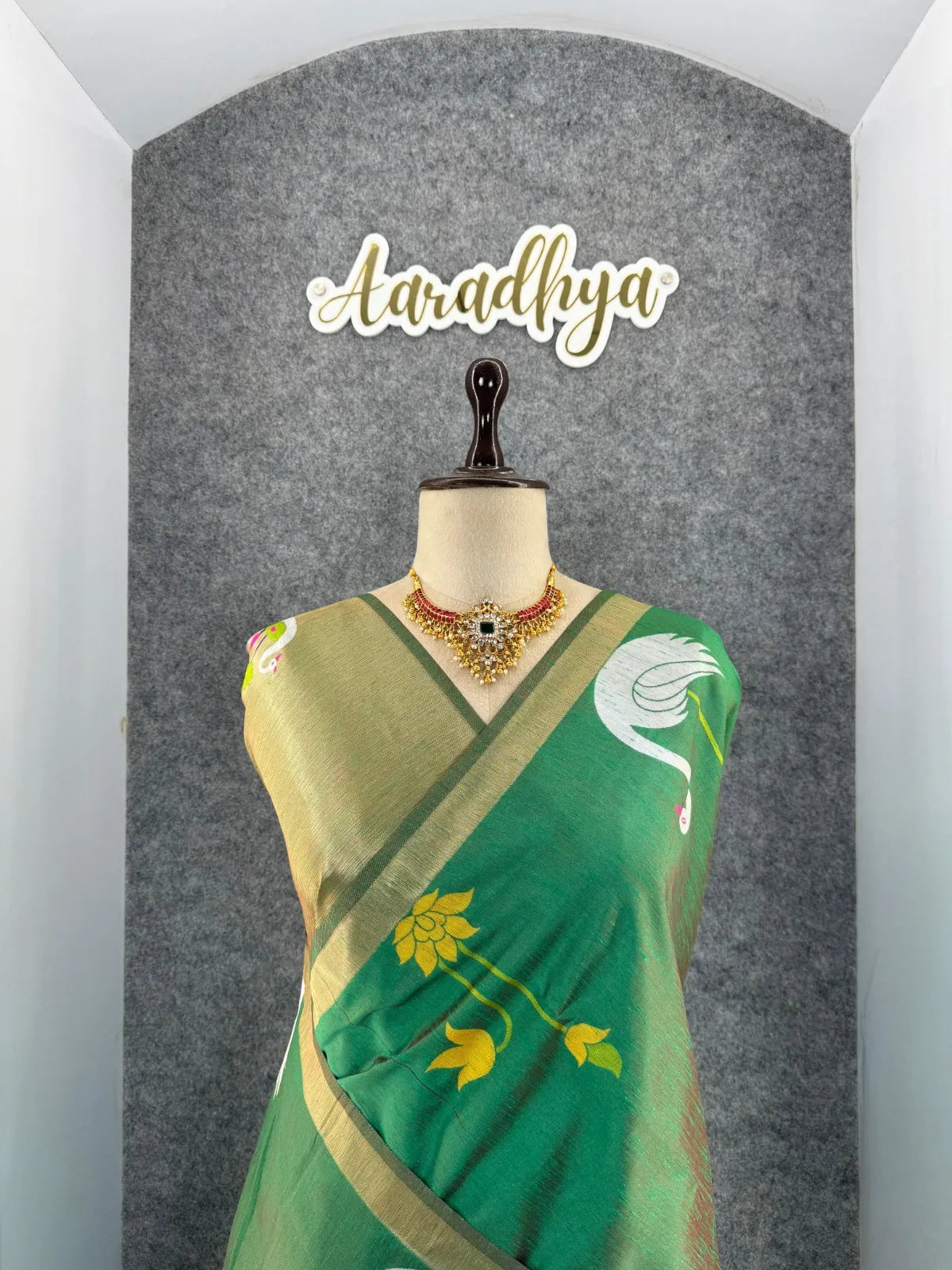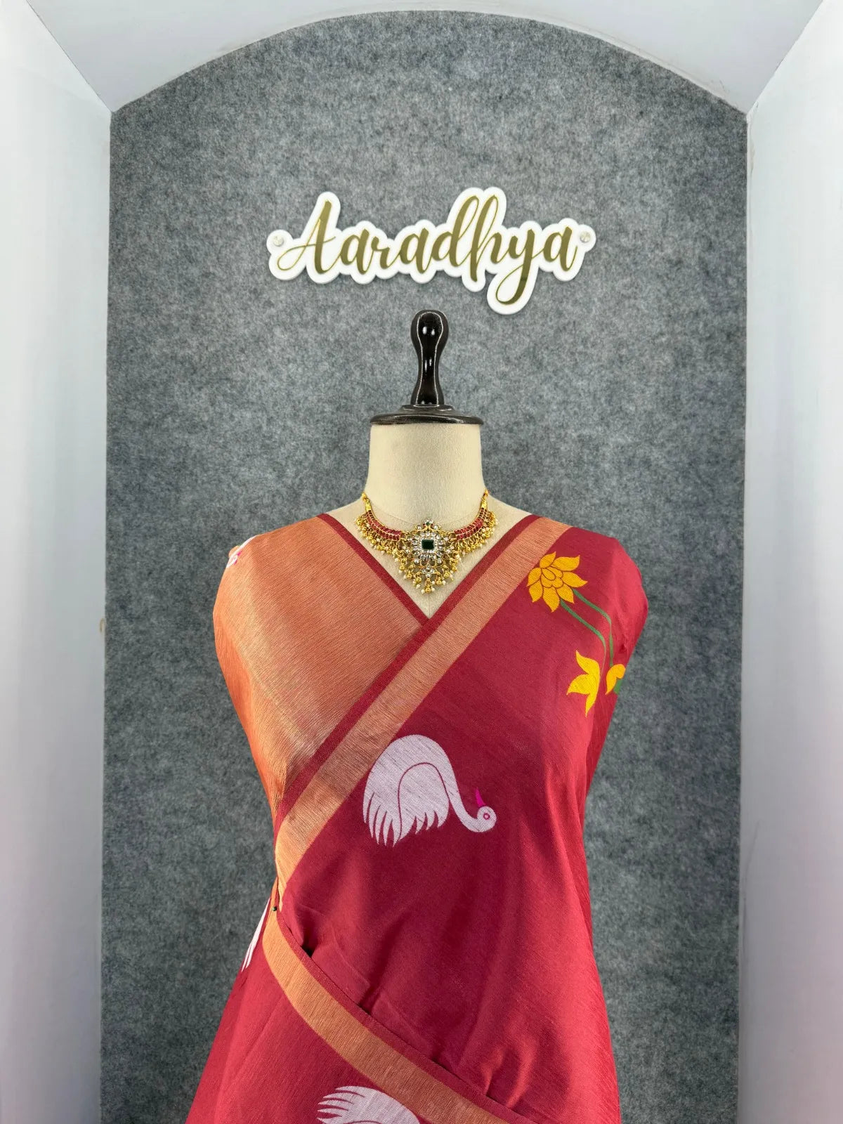 The saree is paired with a contrast brocade (Brocade) blouse, adding a luxurious finish to the overall look.