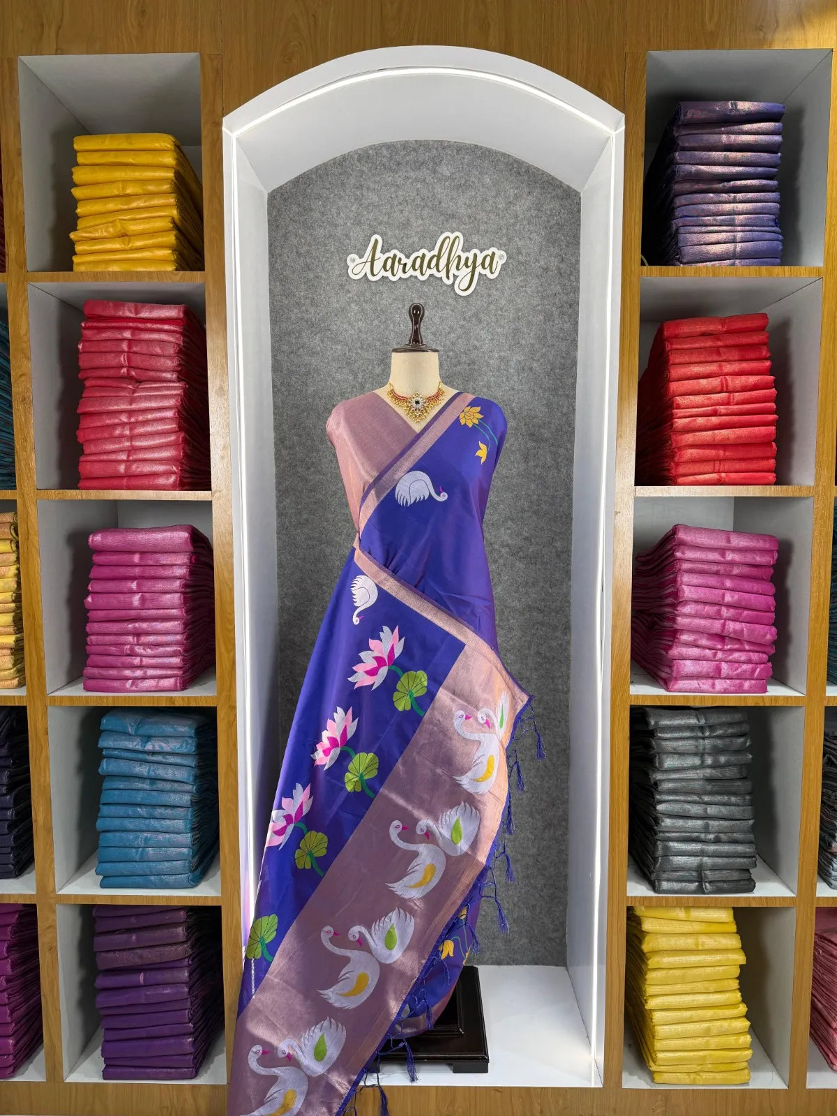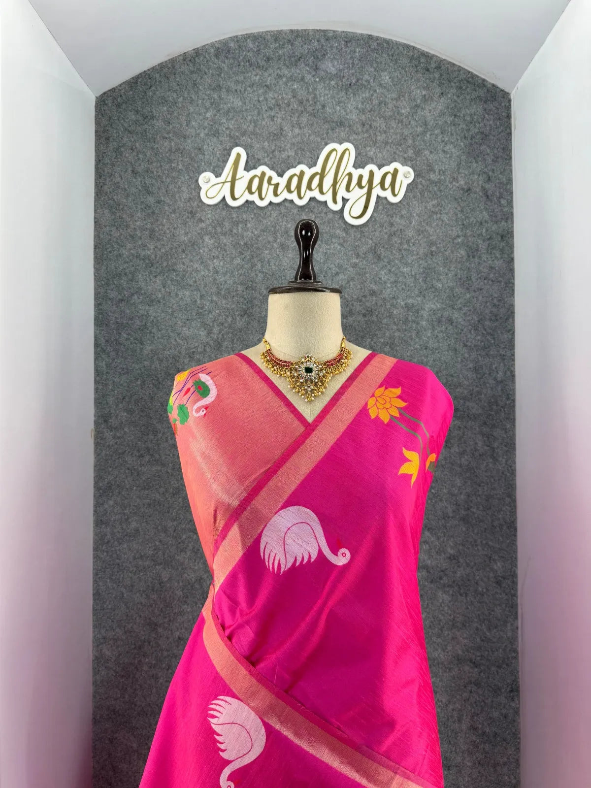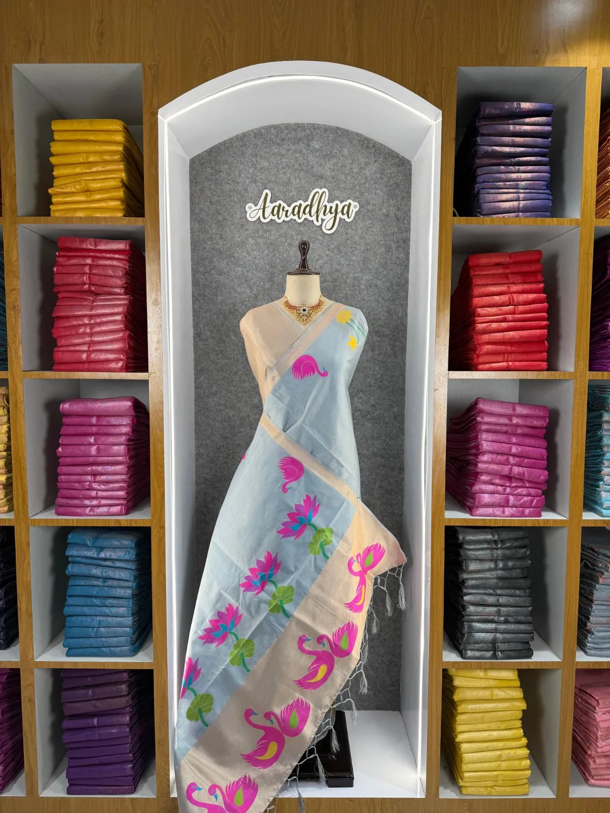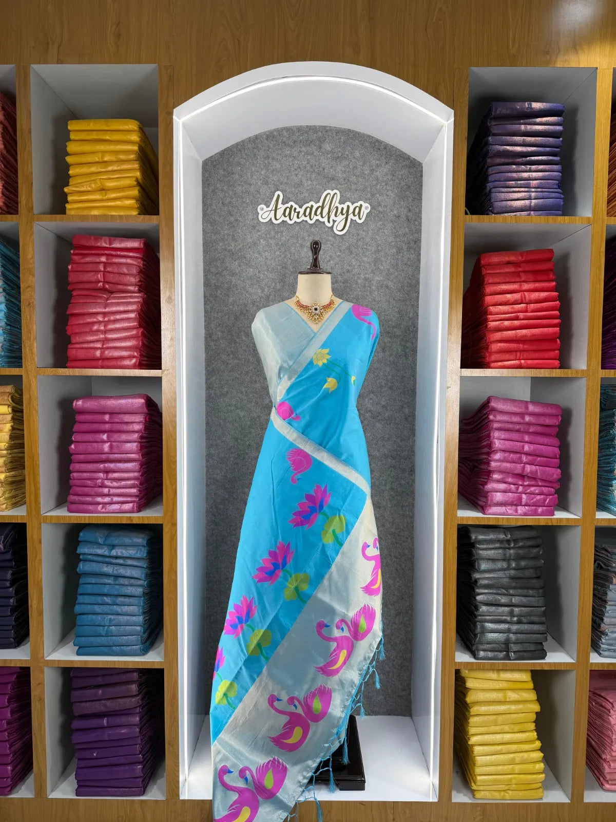 The saree is paired with a contrast brocade (Brocade) blouse, adding a luxurious finish to the overall look.