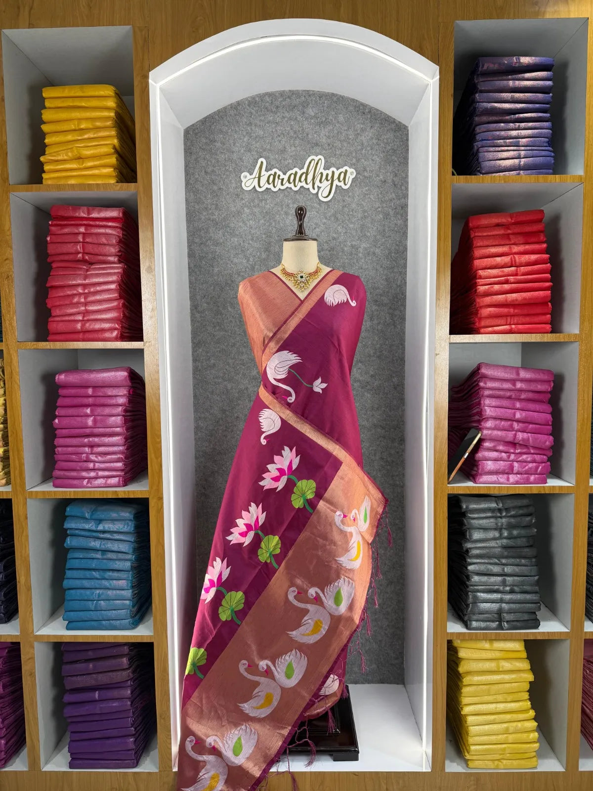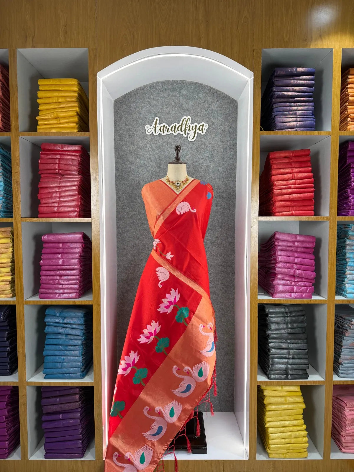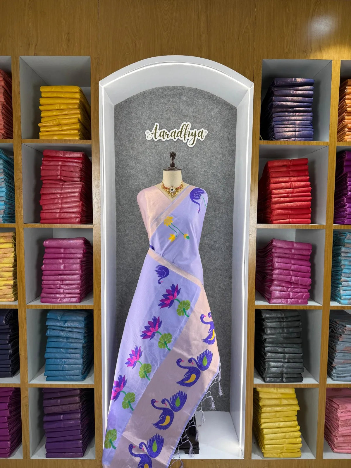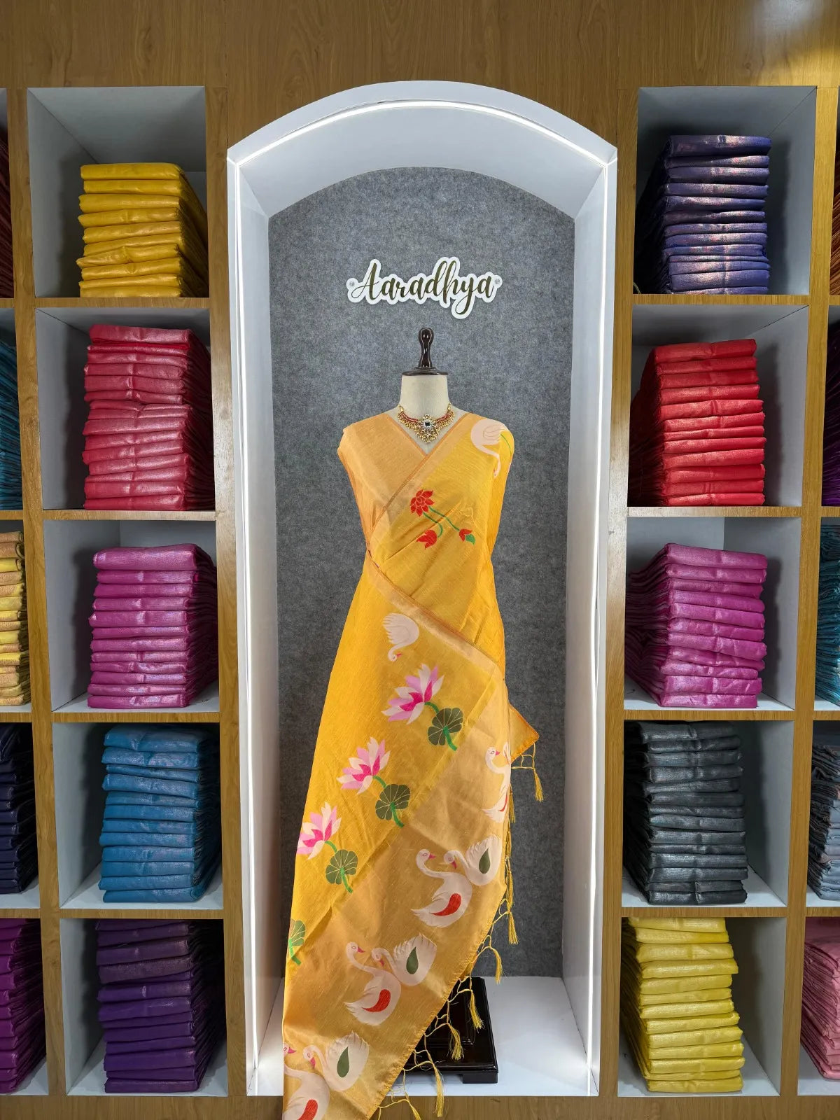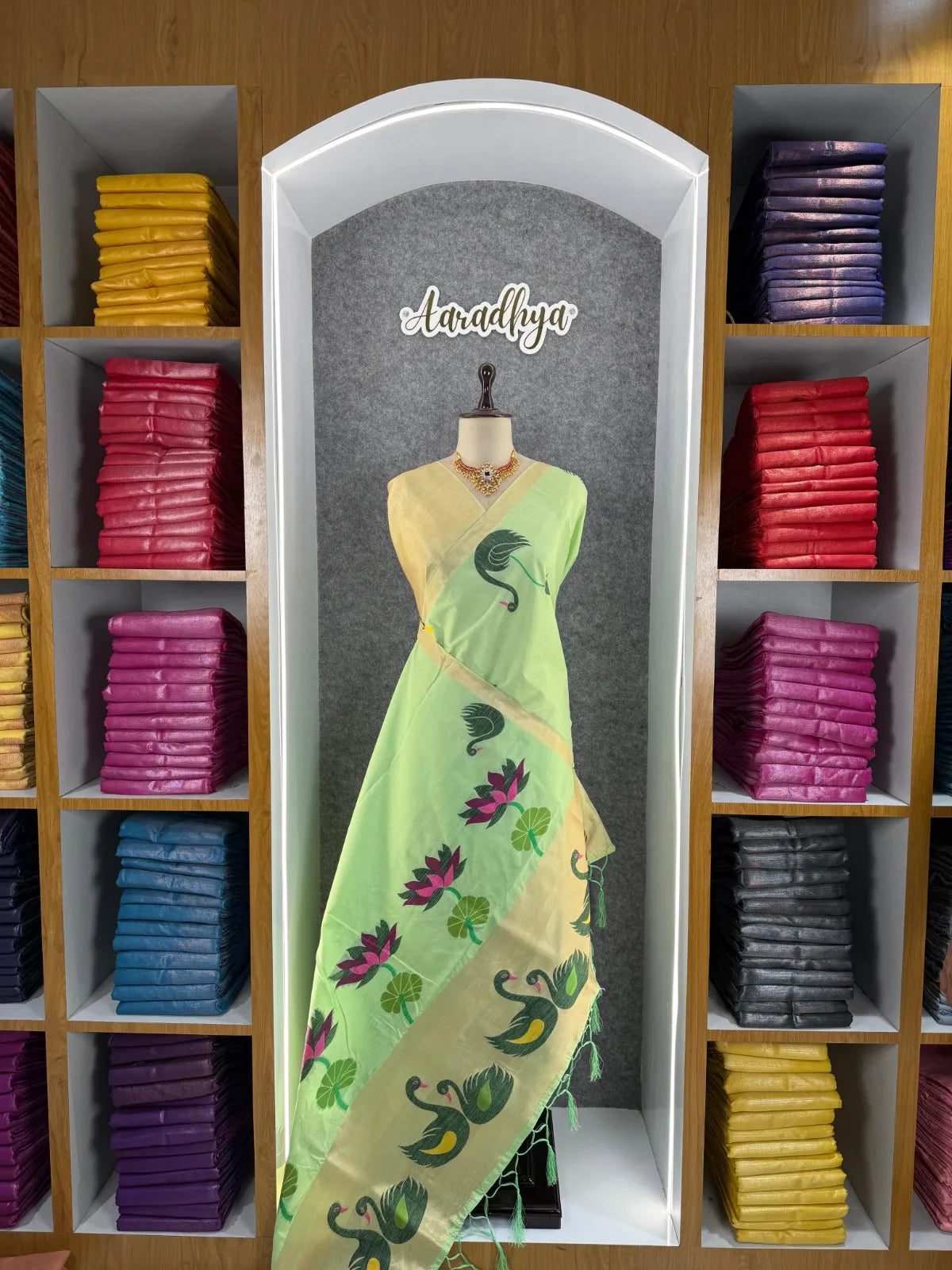 The saree is paired with a contrast brocade (Brocade) blouse, adding a luxurious finish to the overall look.