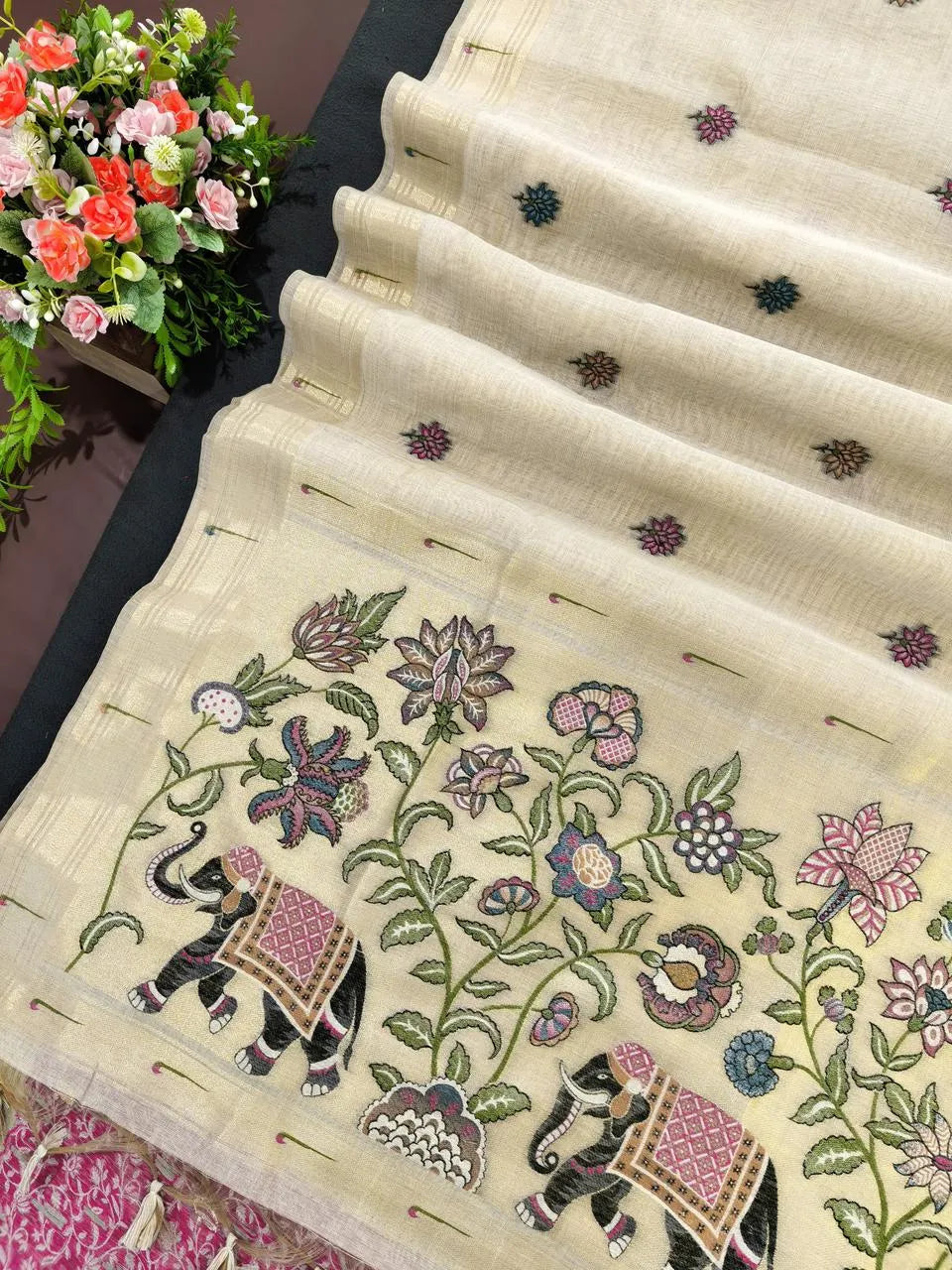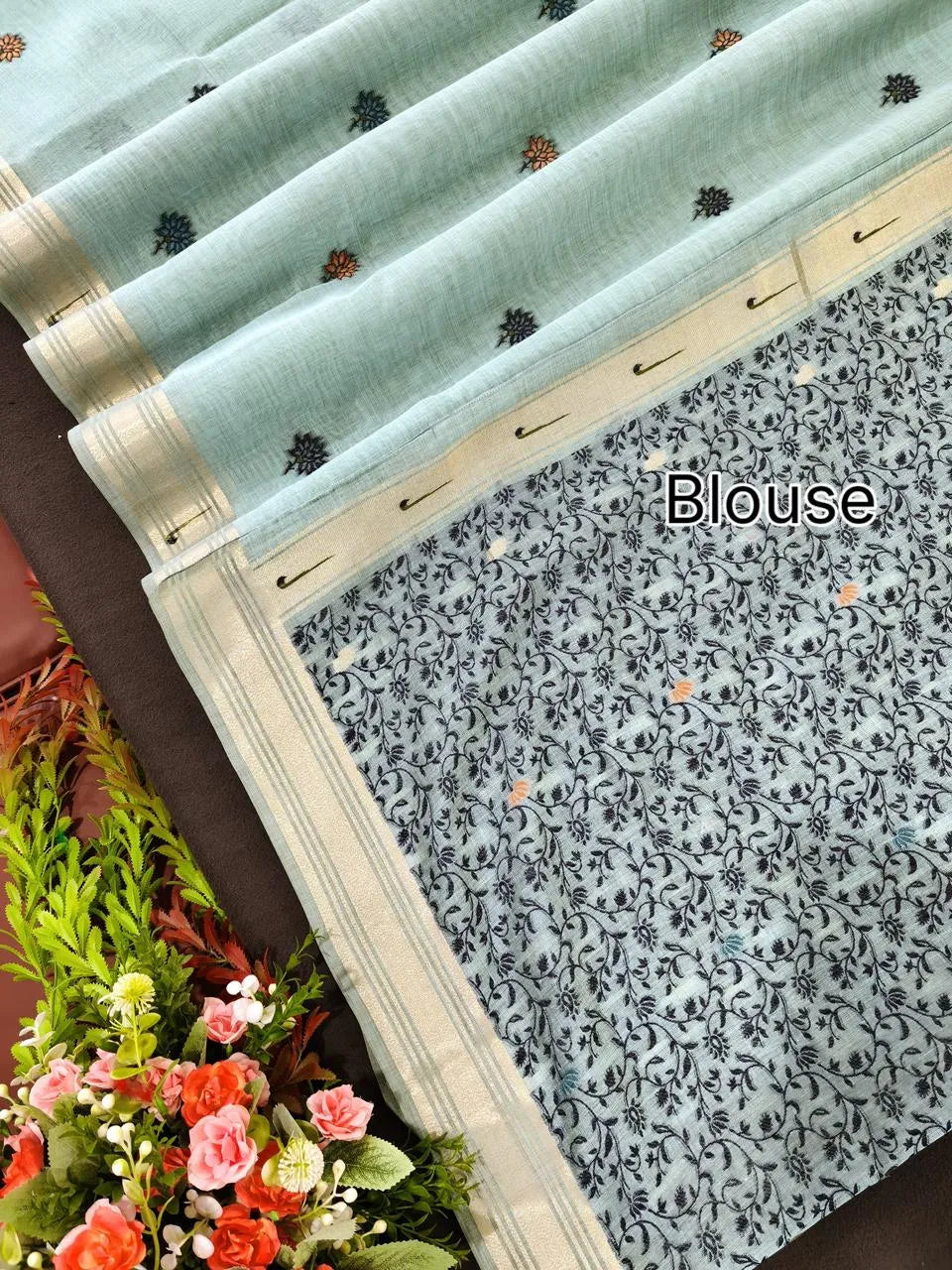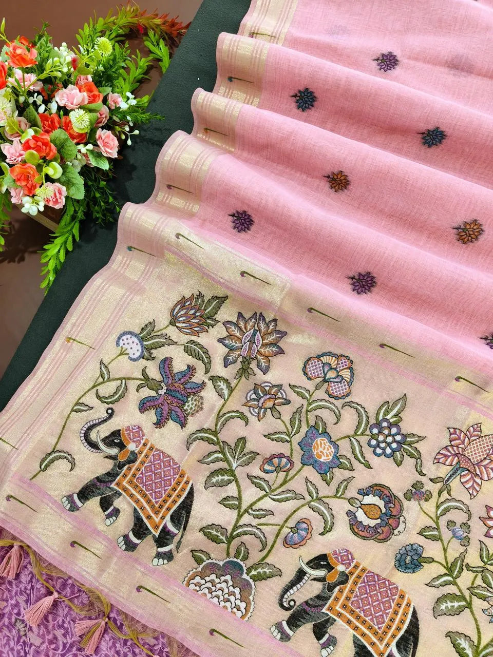 The saree is beautifully enhanced with a classic Paithani pallu featuring intricate resham weaving, showcasing rich floral motifs and traditional elements inspired by authentic Maharashtrian artistry. A finely detailed muniya weaving zari border adds a subtle touch of heritage luxury, while the body is adorned with delicate all-over woven butties, lending the saree a refined and sophisticated charm.