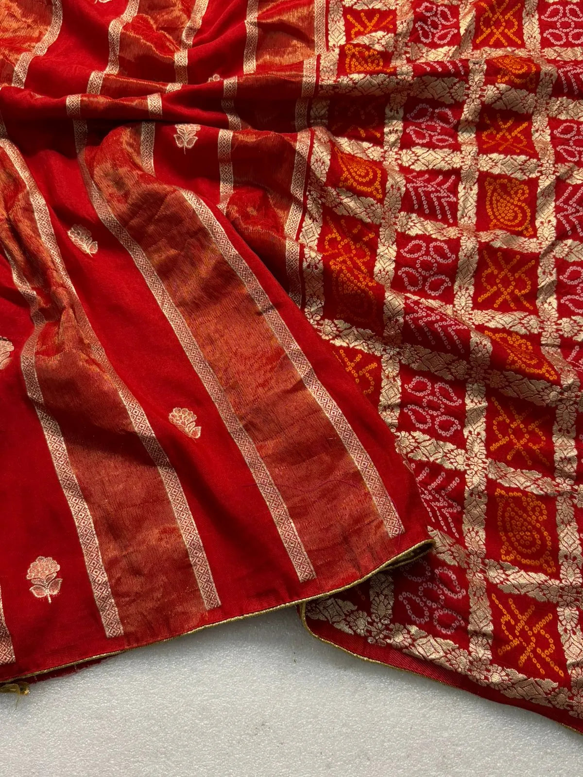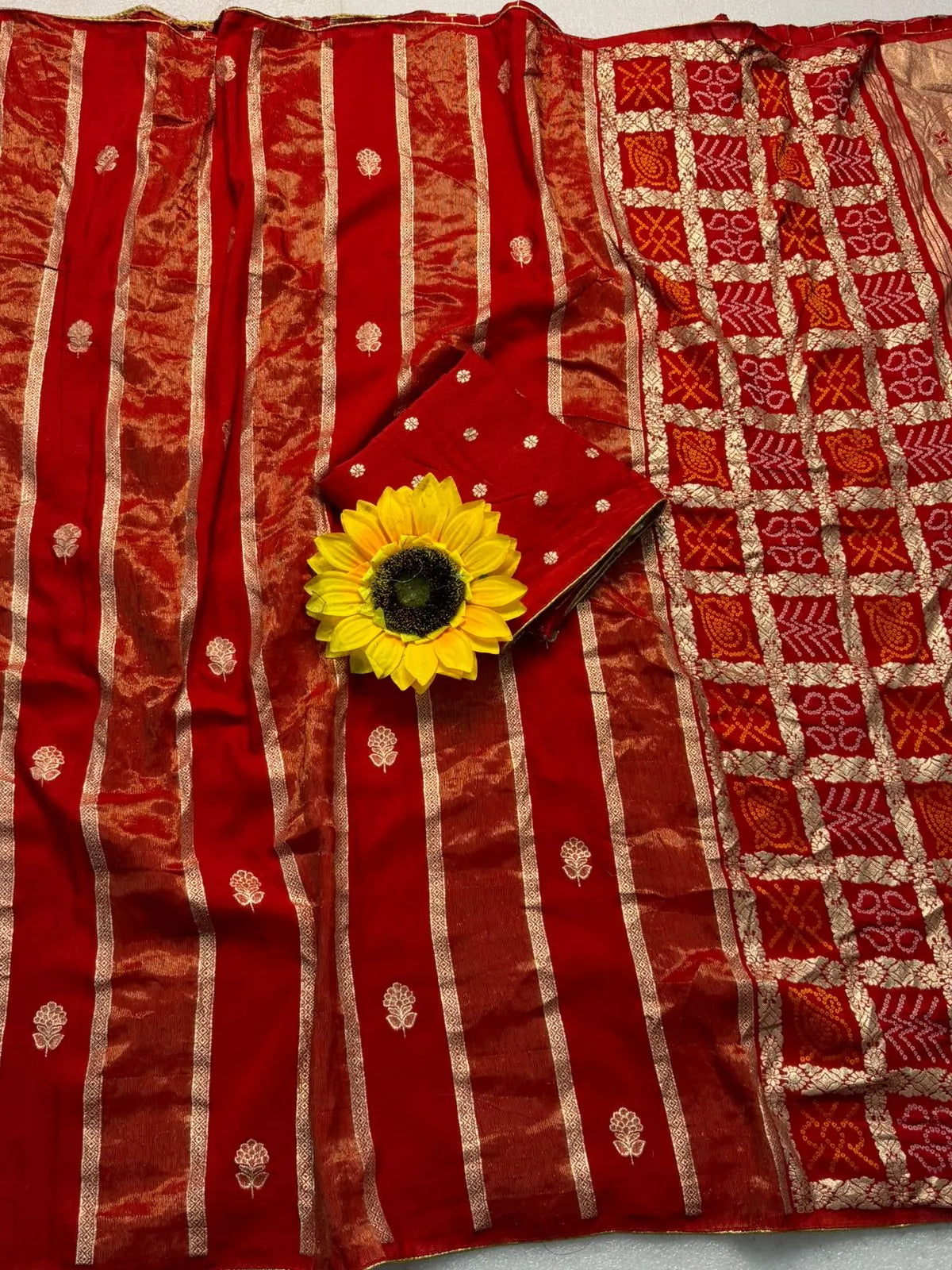 Royal Dola Silk Saree with Jaipuri Style Heavy Pallu crafted in premium heavy dola silk, featuring traditional lagdi patta weaving with intricate zari fusion work. The saree is beautifully enhanced with a rich Jaipuri style heavy pallu and elegant all-over butti design, giving it a royal and festive look.