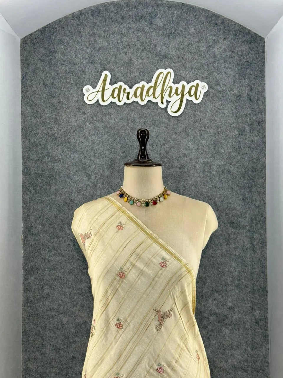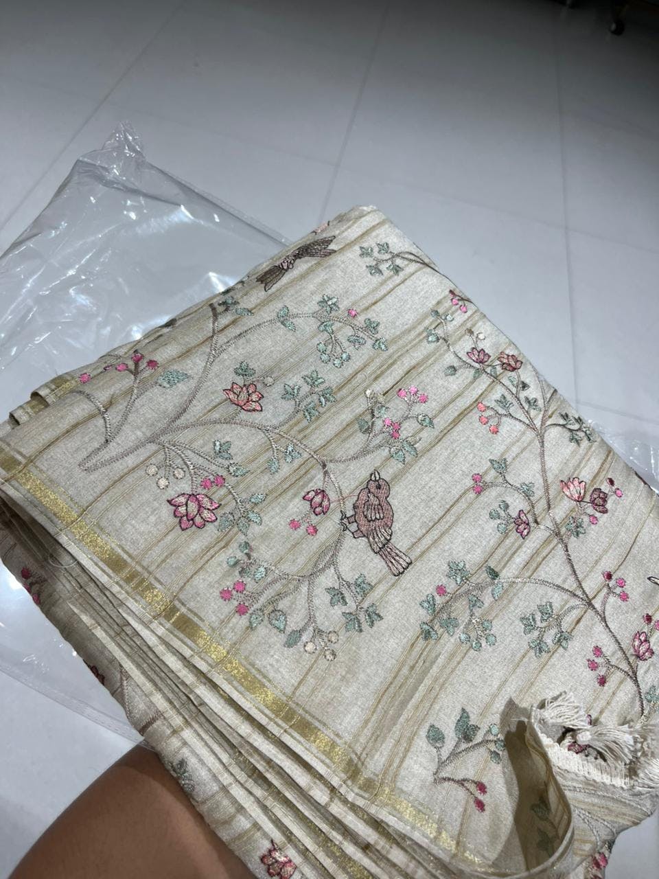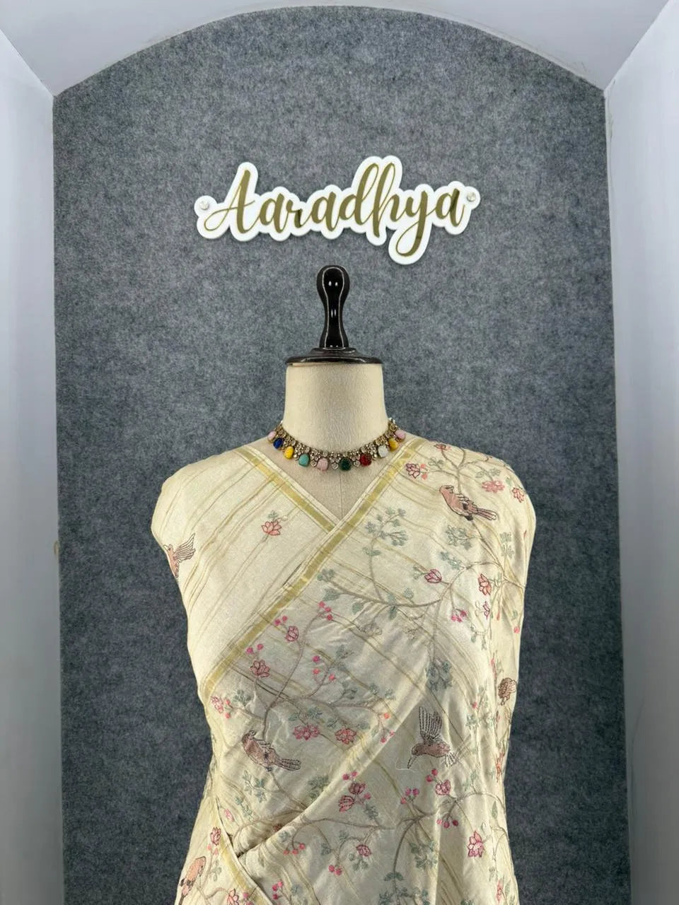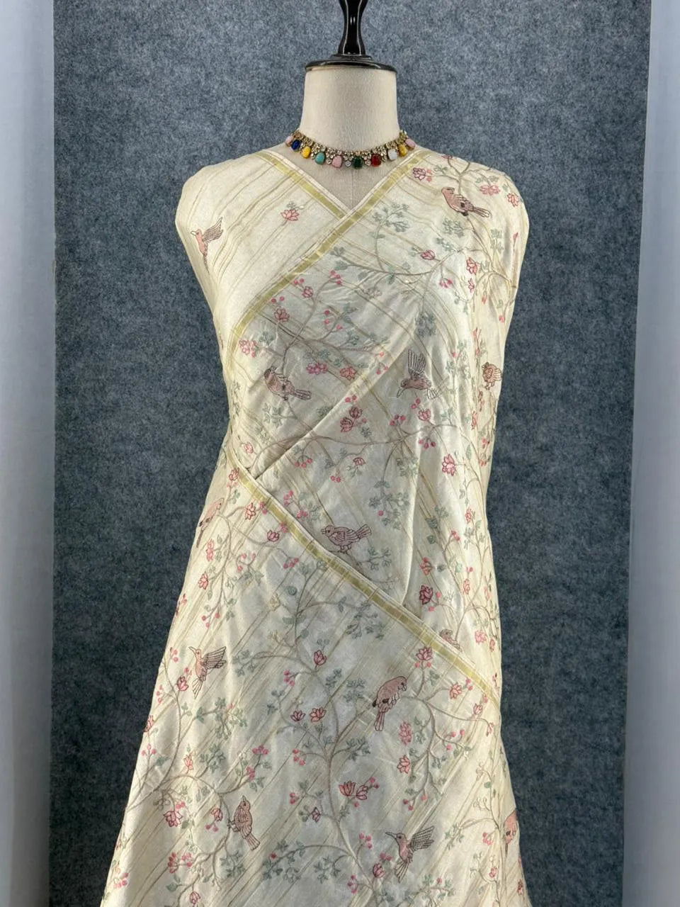 The saree features a soft, natural Tussar silk base adorned with delicate floral and bird embroidery, giving it a graceful and artistic appeal. Light in weight with a subtle sheen, it offers a comfortable drape perfect for festive occasions, day functions, and elegant gatherings.