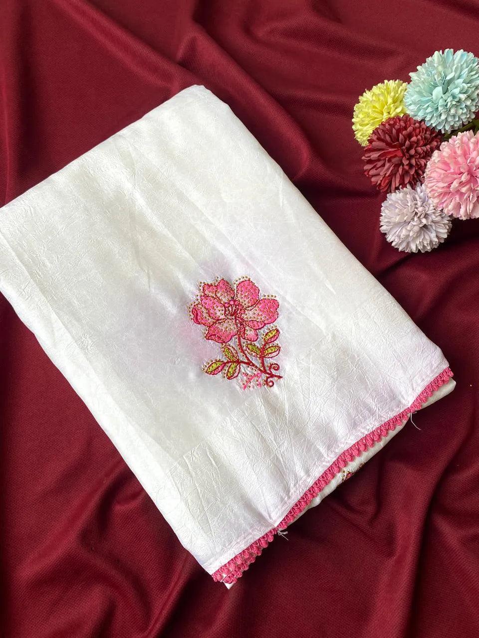Grace meets grandeur in this exquisite Pure Crush Chinnon Saree, crafted in an elegant white tone and adorned with delicate all-over Swarovski-style embellishments and fine embroidery. The saree is beautifully accented with a contrast pink lace border, adding a luxurious touch that enhances its timeless charm.