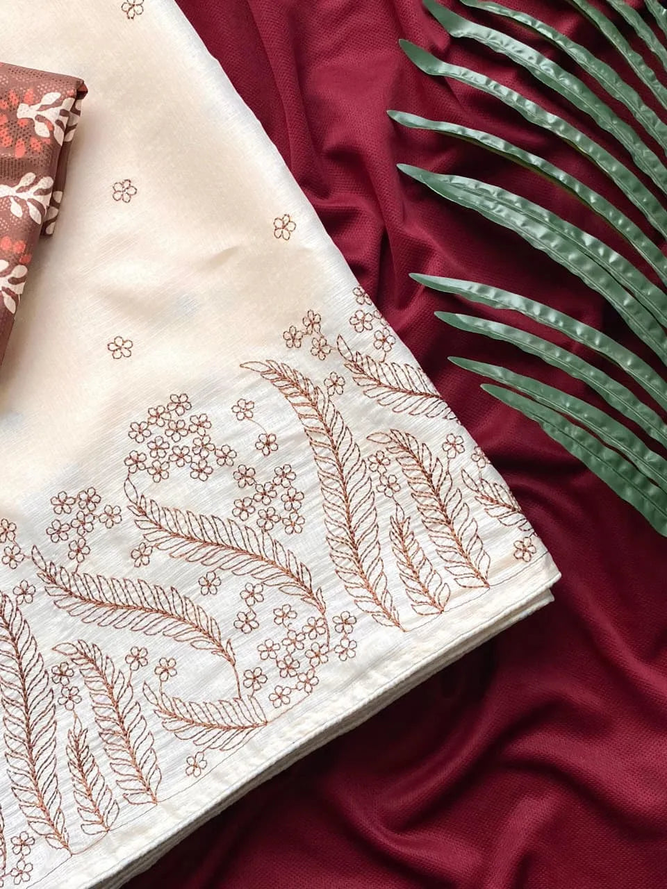 Paired with a beautiful contrast blouse featuring floral print, this combination creates a fresh and elegant festive look.
