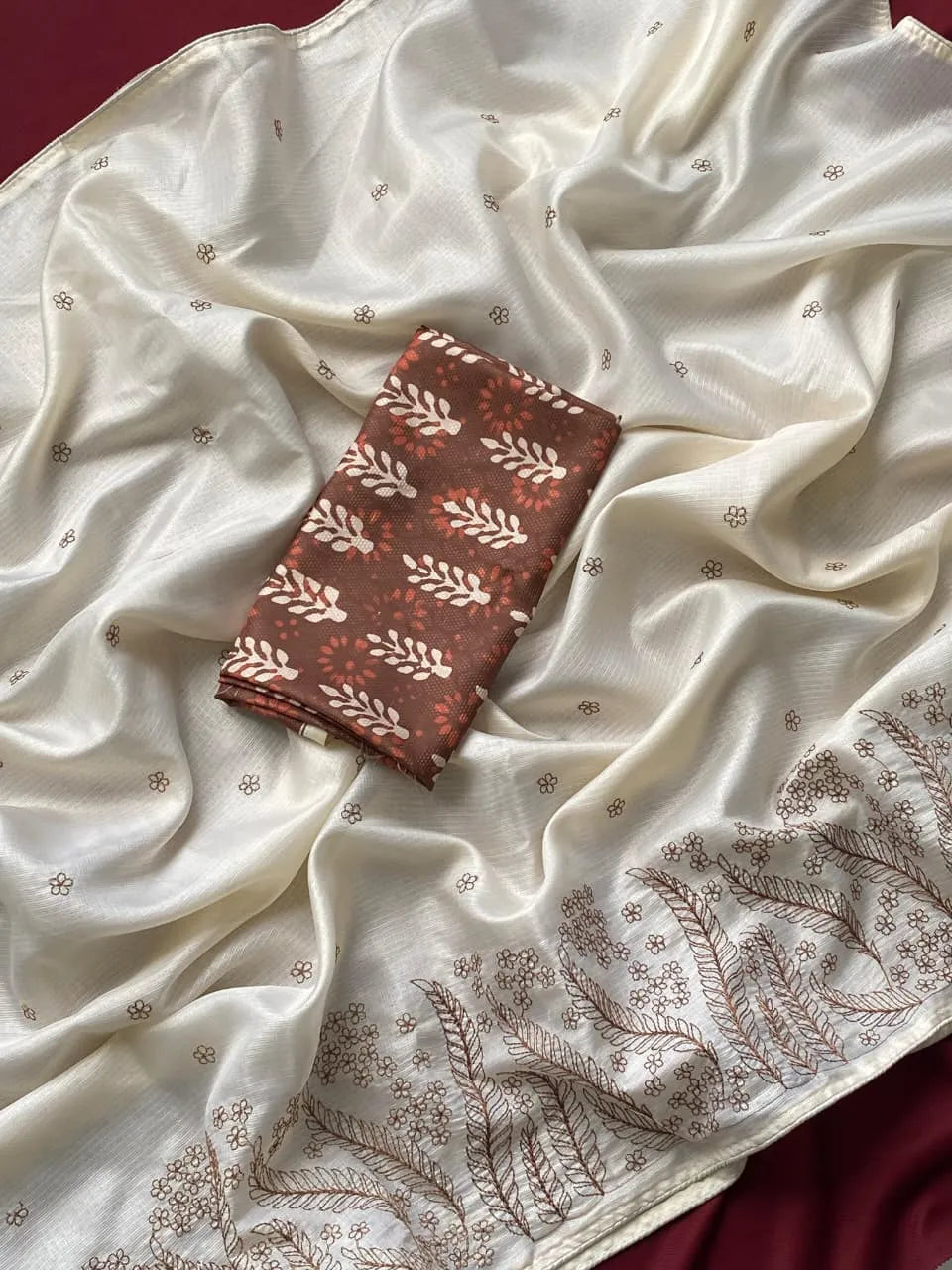 The saree is further adorned with delicate all-over buttis, adding subtle richness and traditional charm.