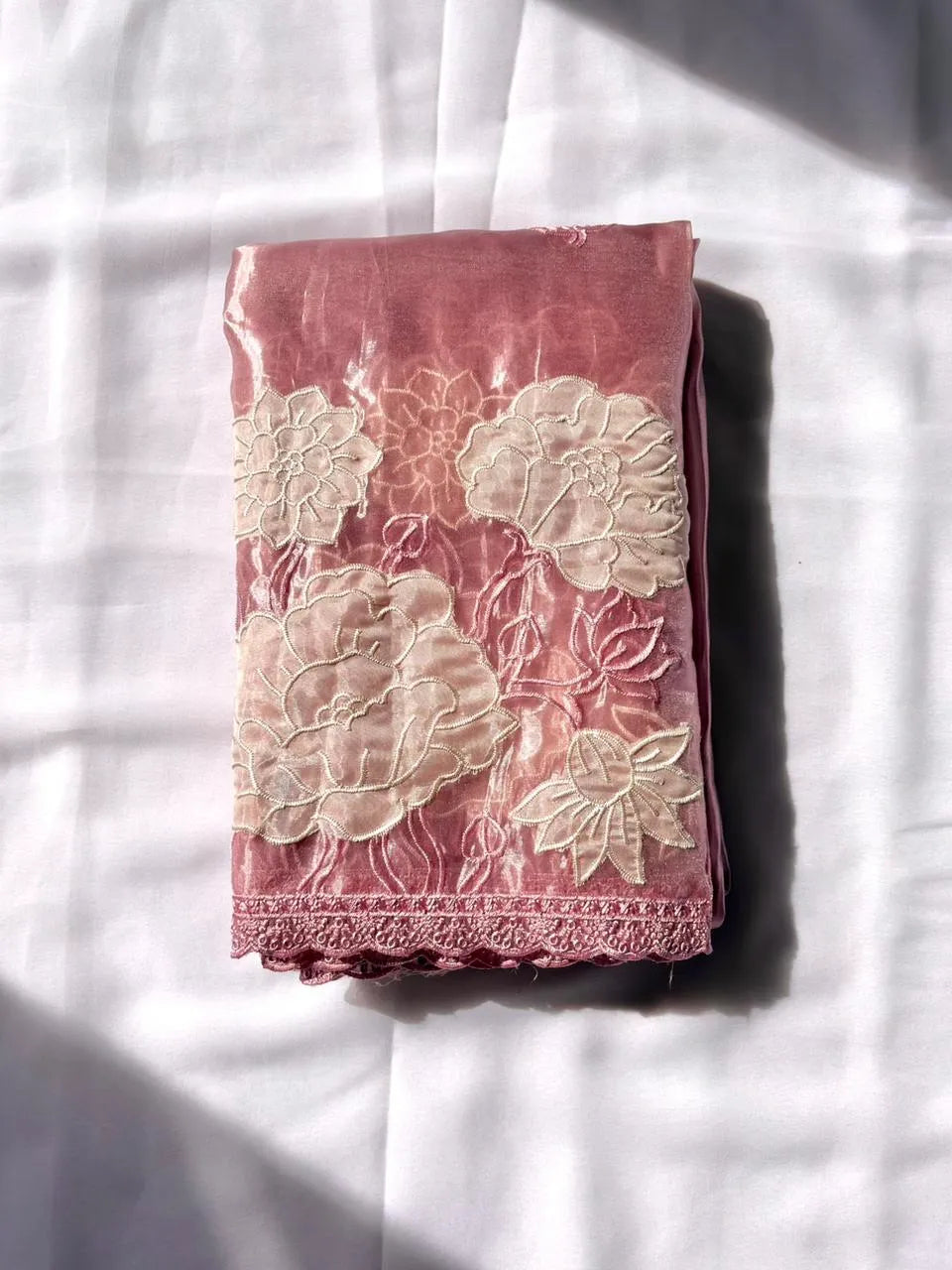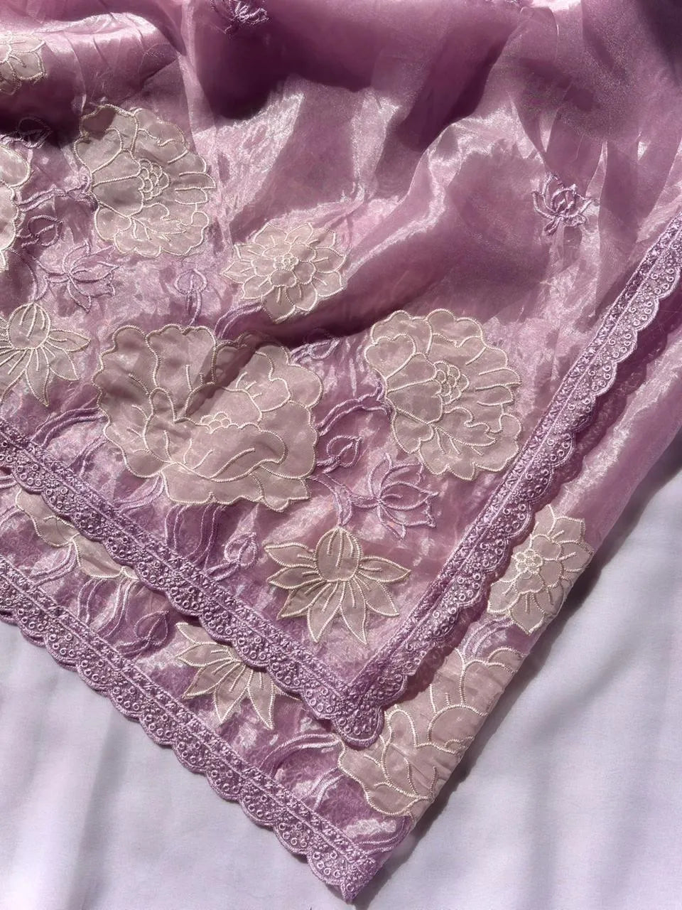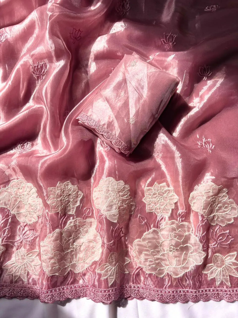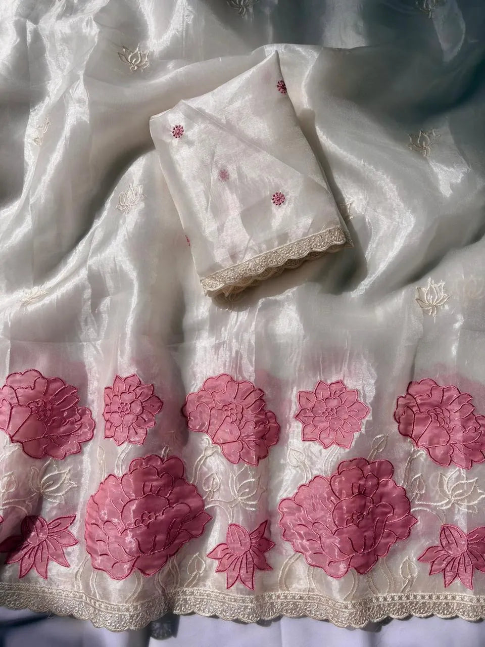 Pure Oris Silk Lotus Embroidered Applique Cutwork Border Saree