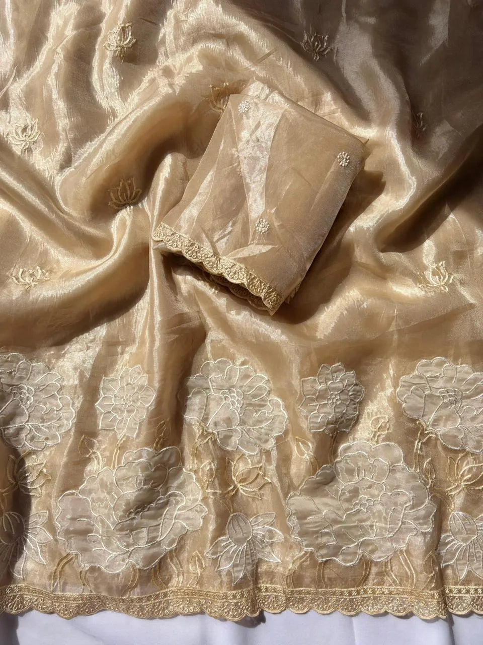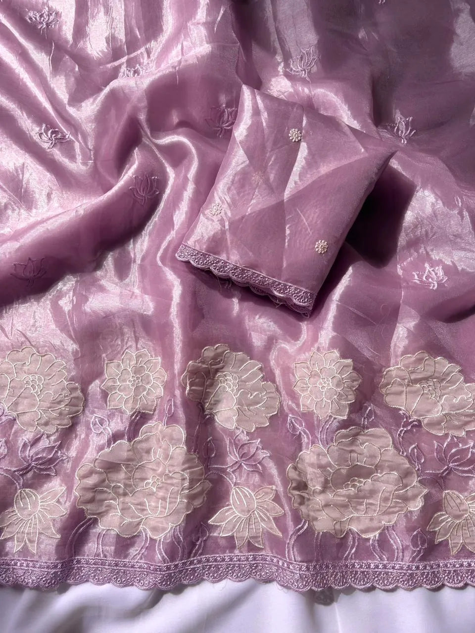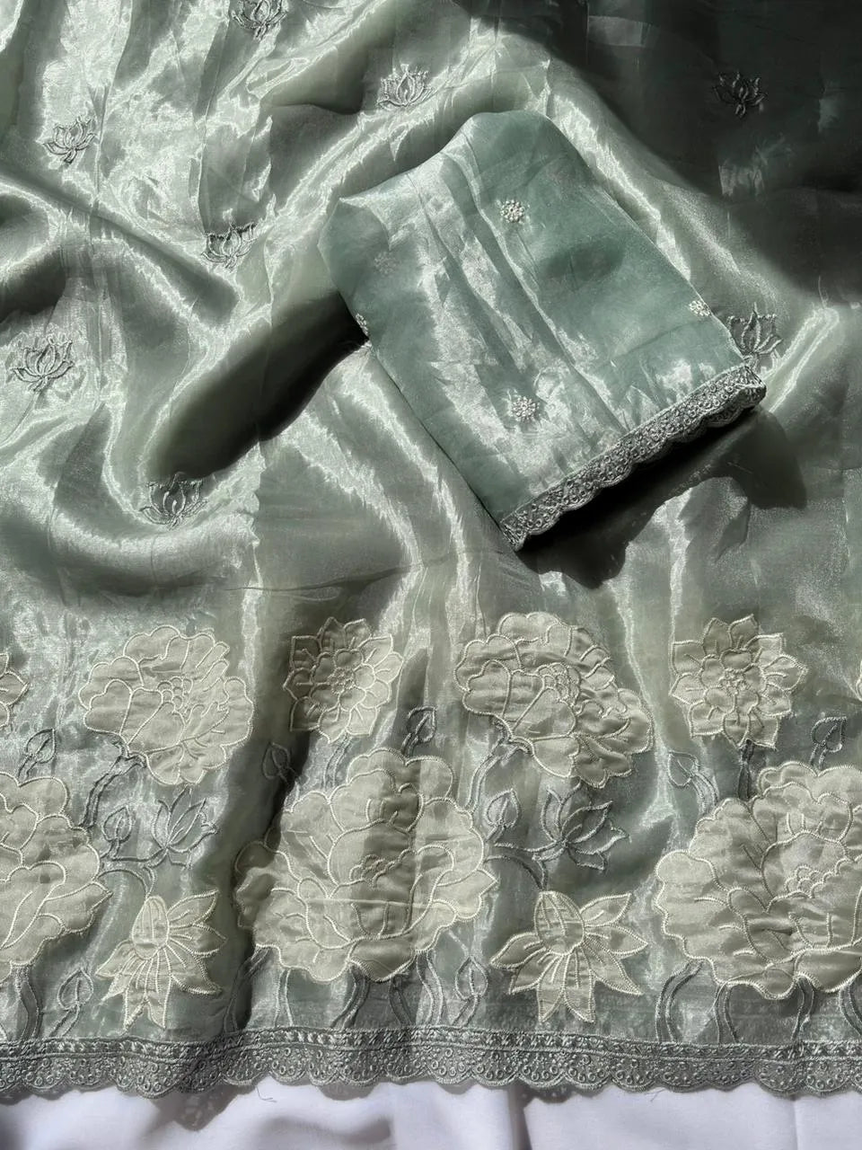 Pure Oris Silk Saree, beautifully adorned with lotus embroidered butti motifs all over the body. The saree is crafted using an exquisite flower-embroidered applique work panel cutwork border, adding depth, texture, and a refined handcrafted appeal.