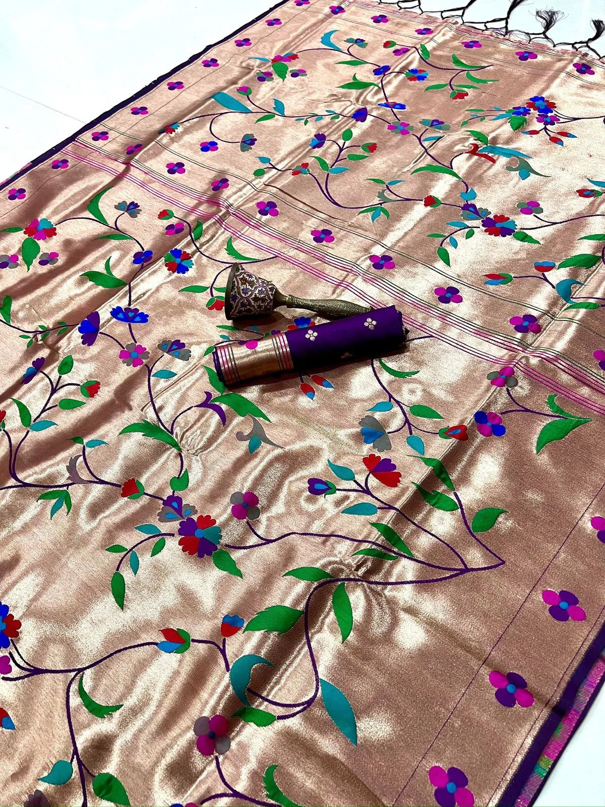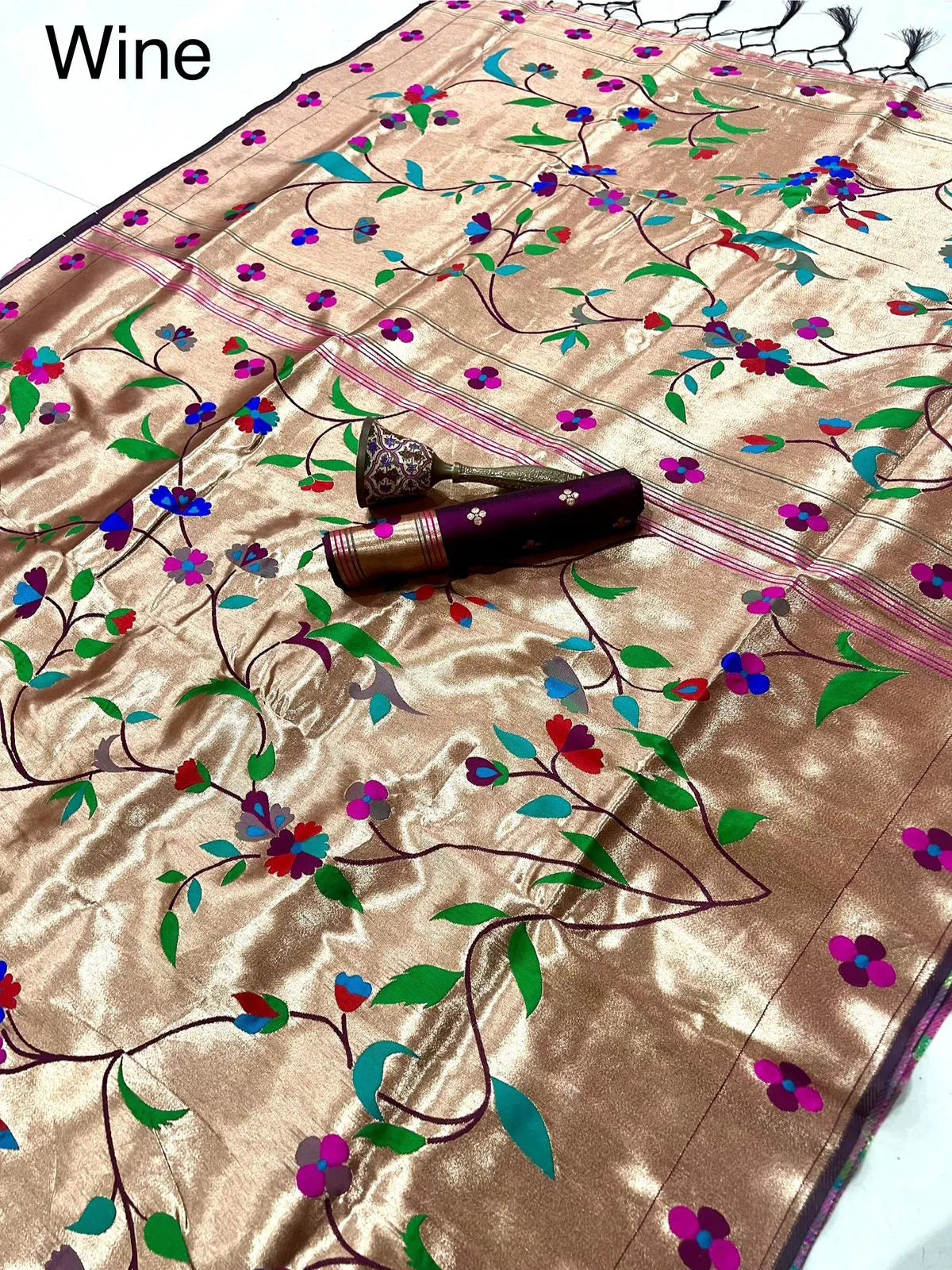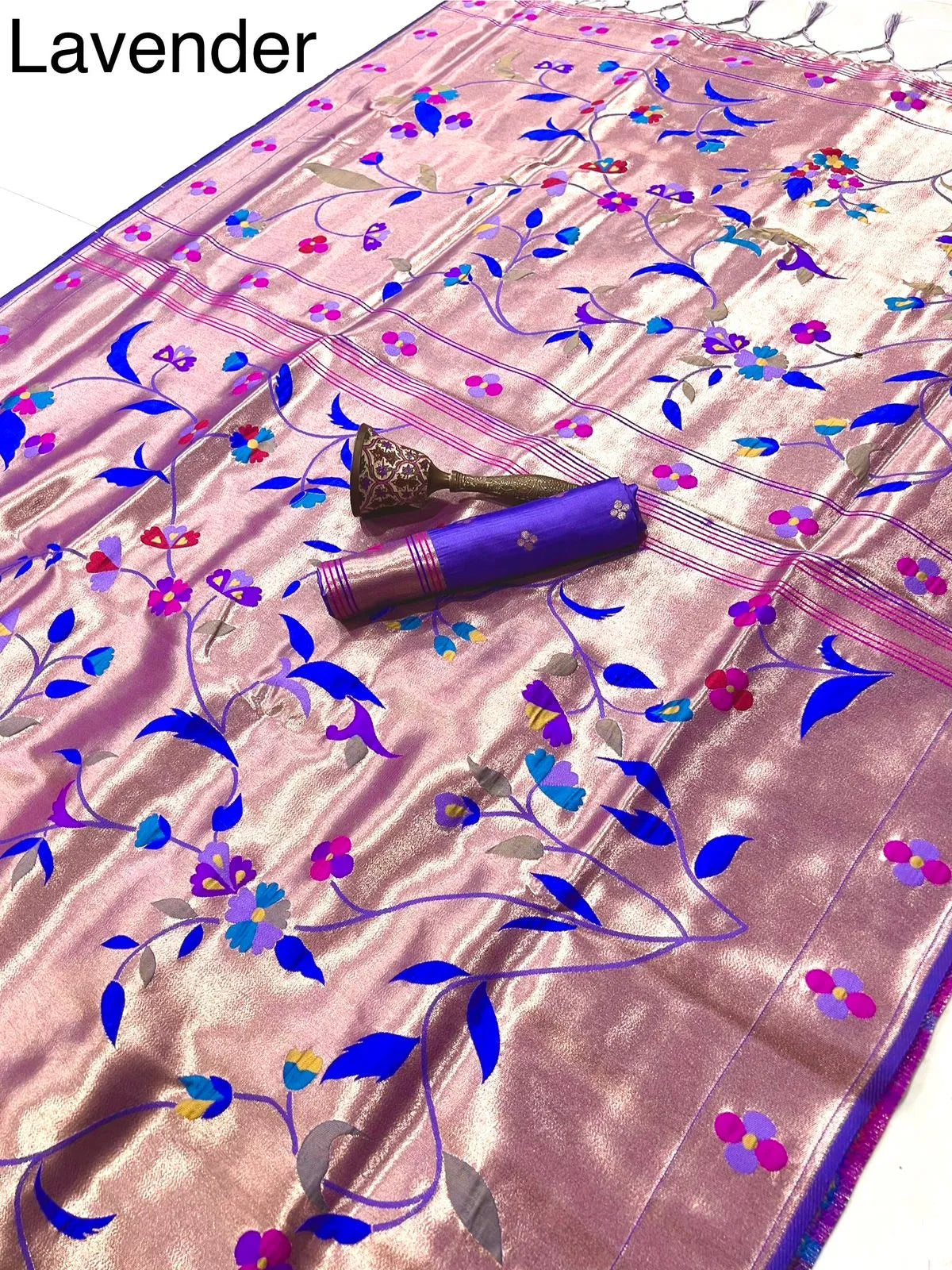 The rich silk base is enhanced with a heavy Meena zari woven pallu, showcasing intricate detailing and vibrant colour artistry inspired by classic Paithani heritage. The luxurious texture, graceful drape, and superior weave make this saree a perfect choice for weddings, bridal wear, festive occasions, temple ceremonies, and grand celebrations.