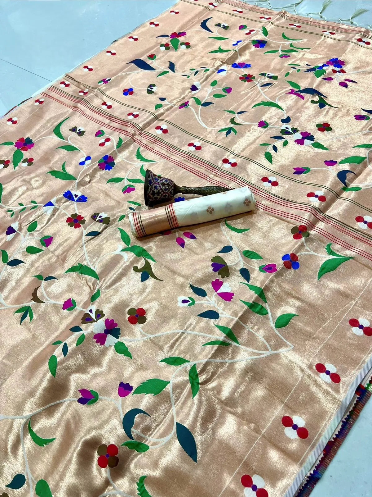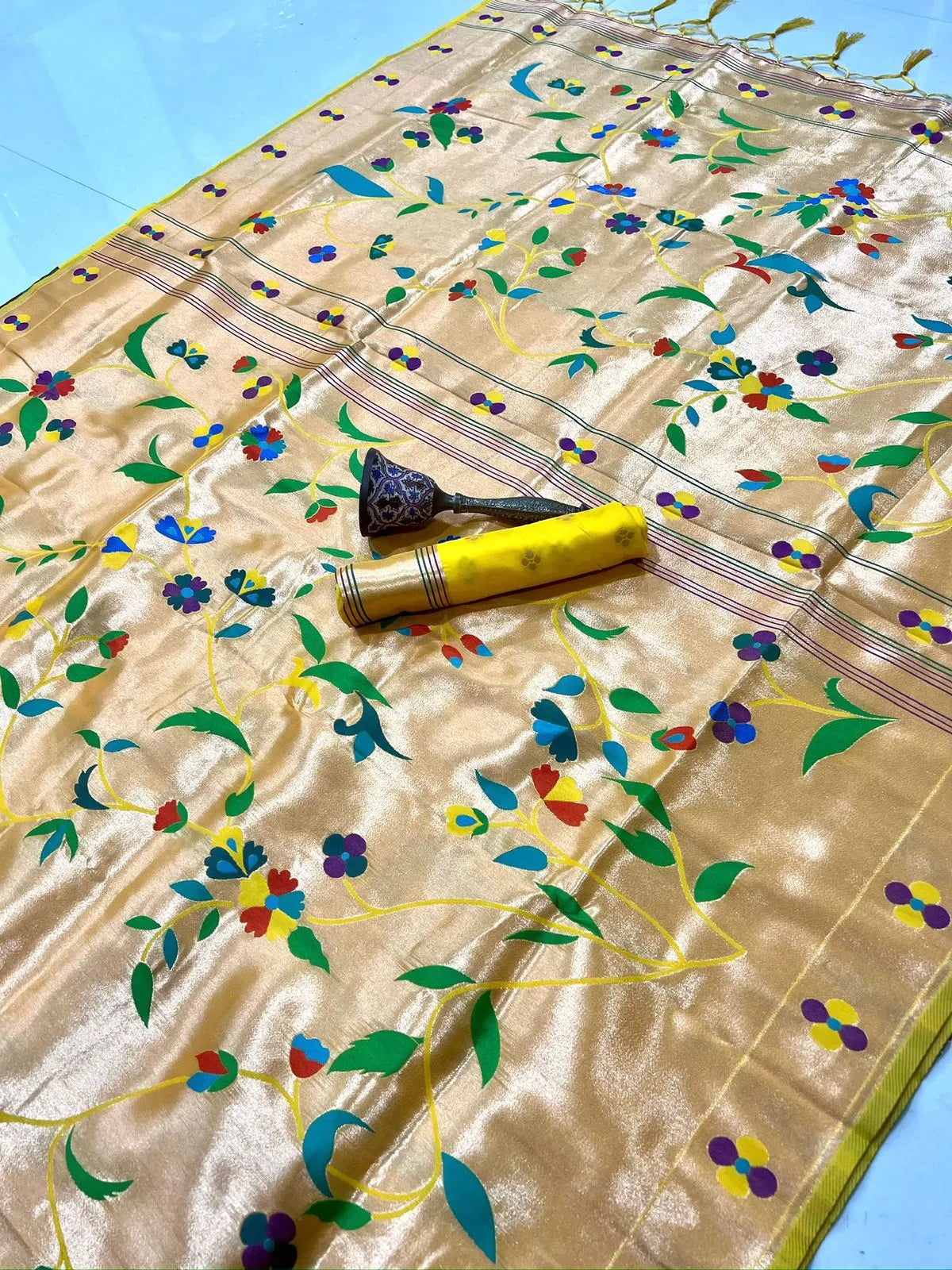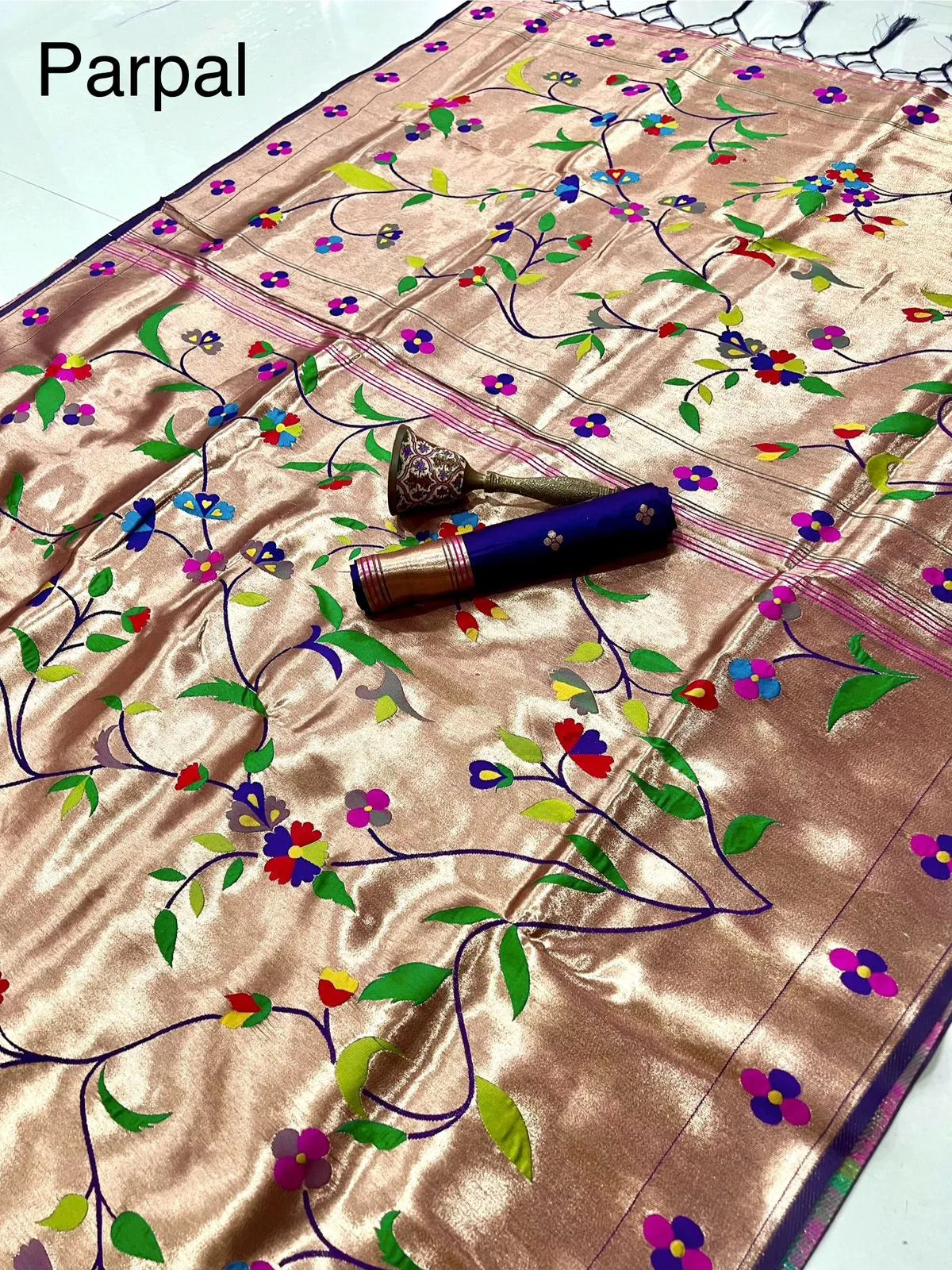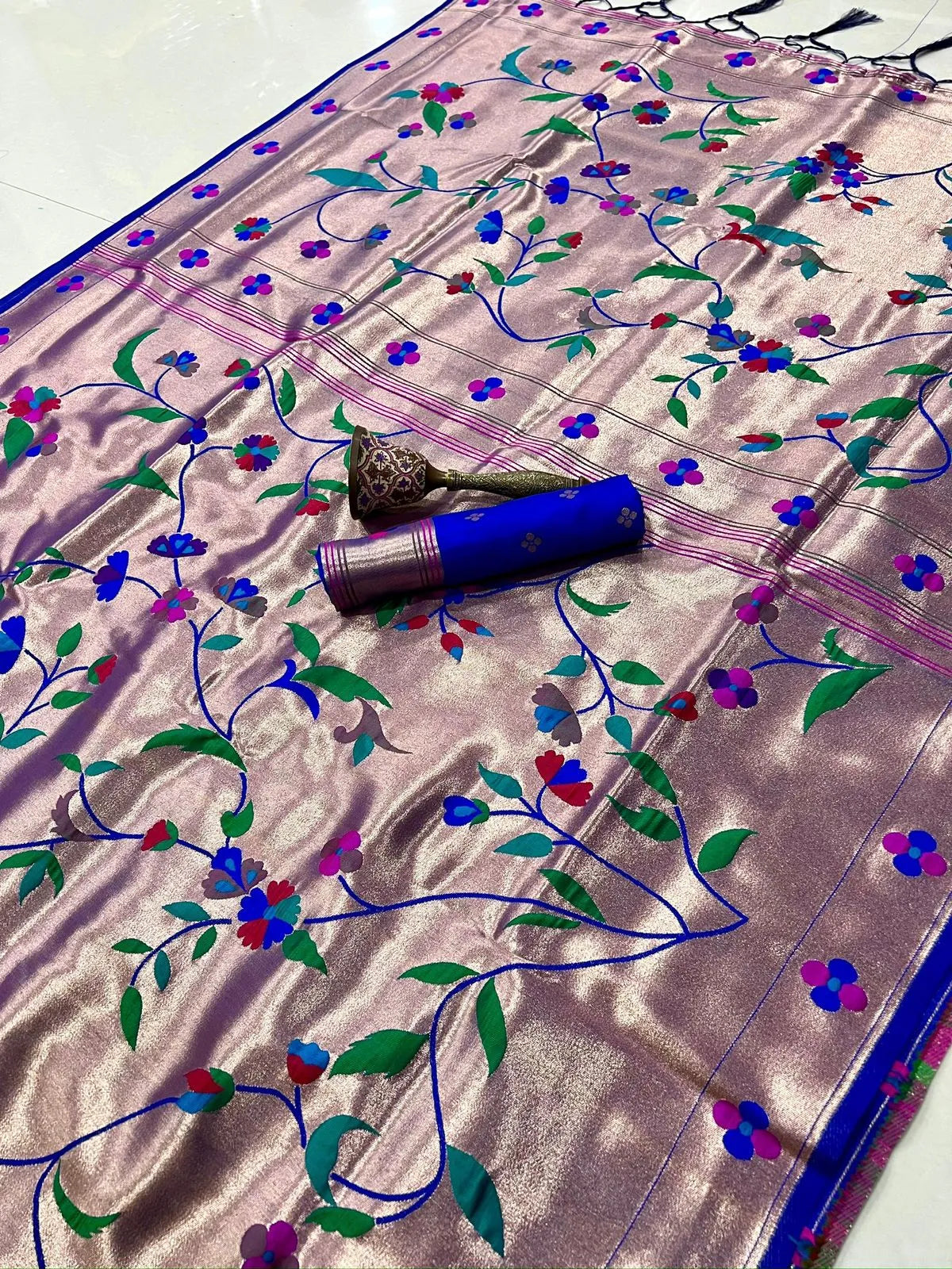 The rich silk base is enhanced with a heavy Meena zari woven pallu, showcasing intricate detailing and vibrant colour artistry inspired by classic Paithani heritage. The luxurious texture, graceful drape, and superior weave make this saree a perfect choice for weddings, bridal wear, festive occasions, temple ceremonies, and grand celebrations.