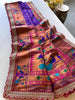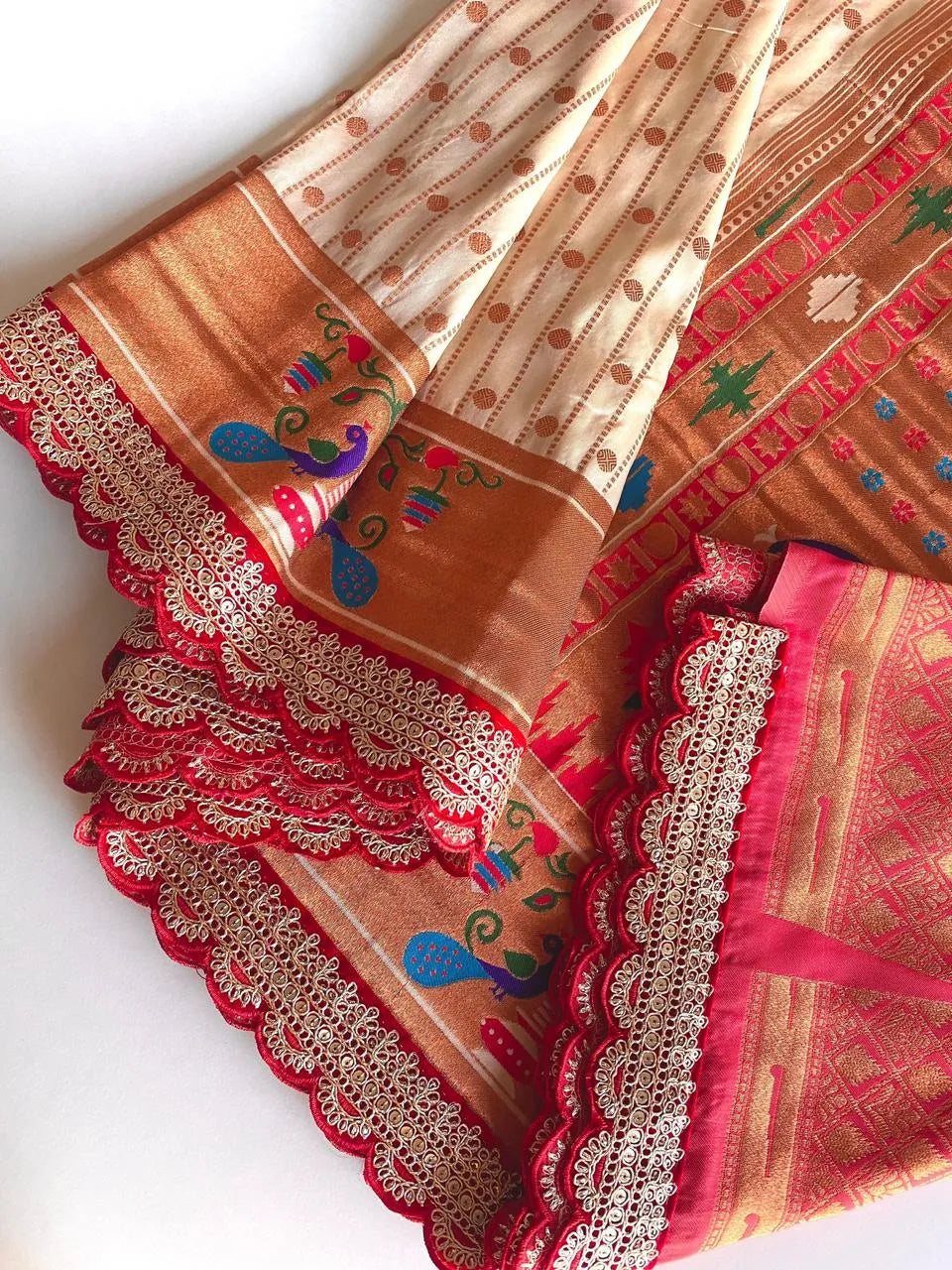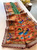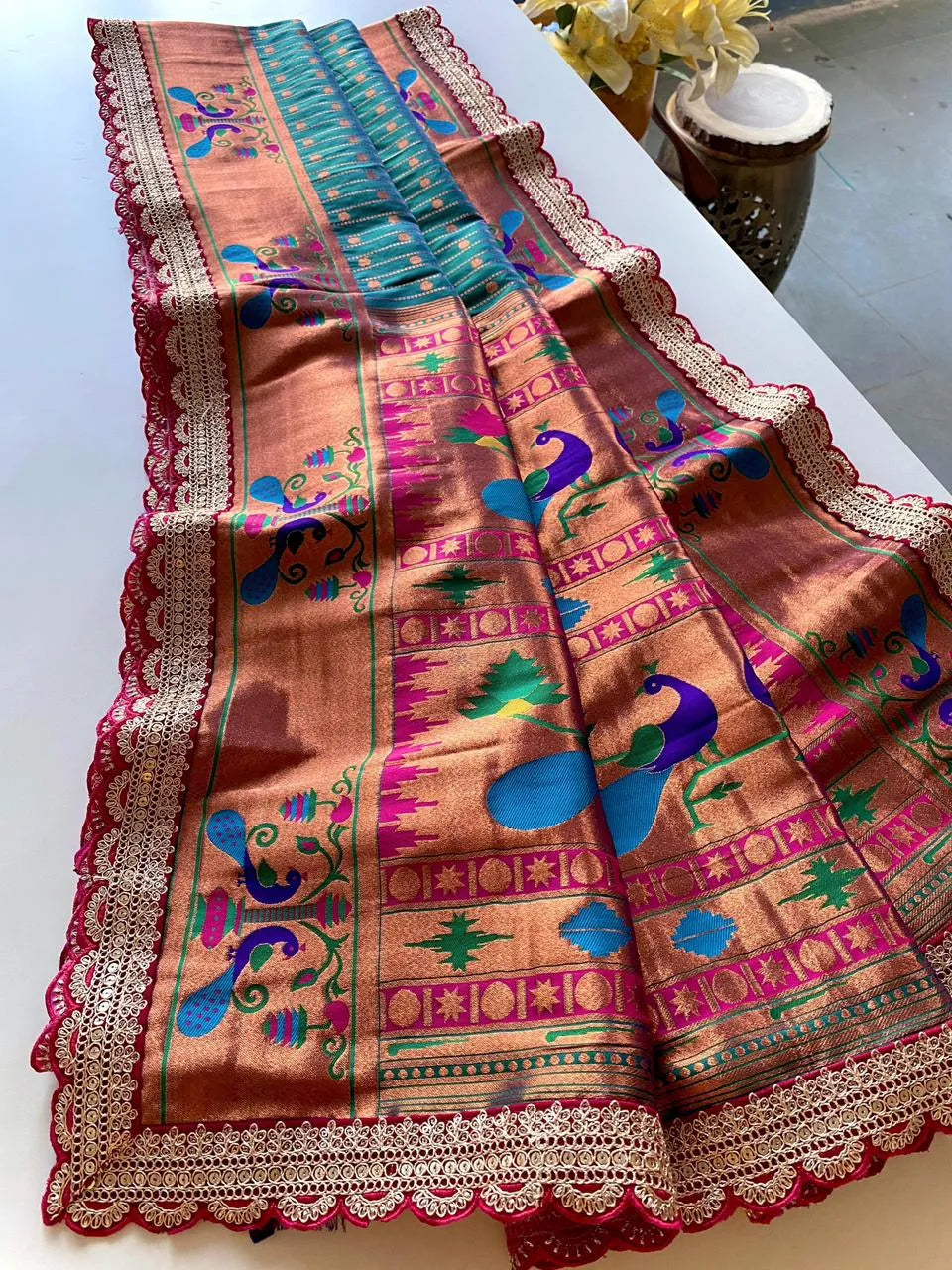 Elevate your ethnic wardrobe with this rich copper-toned silk saree, beautifully inspired by traditional Paithani artistry. The saree features vibrant peacock motifs woven in striking shades of blue, green, and purple, symbolising grace and prosperity. Intricate geometric and floral patterns enhance the body, giving it a regal and heritage-rich appeal.