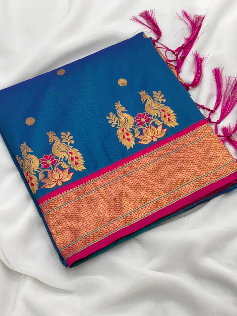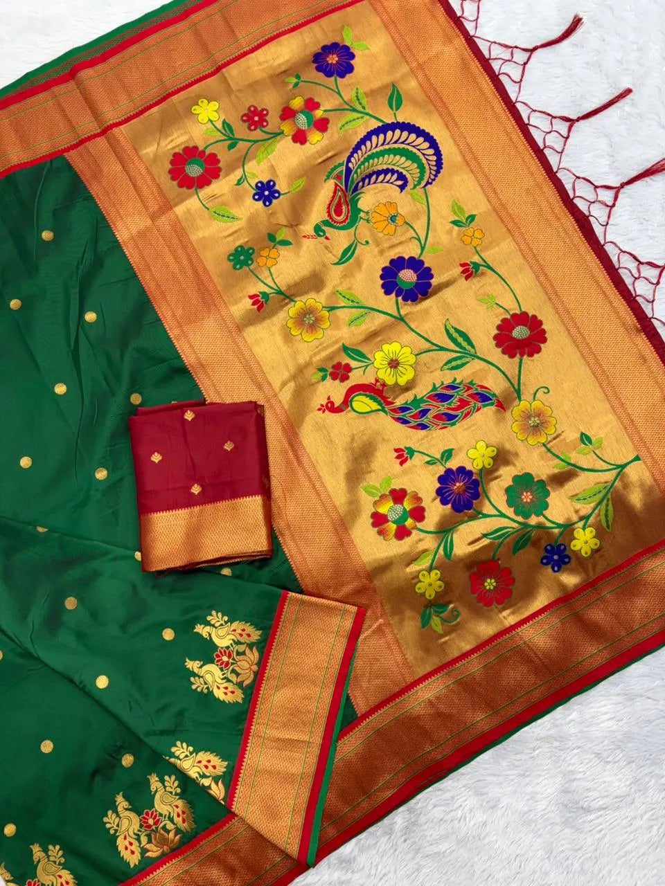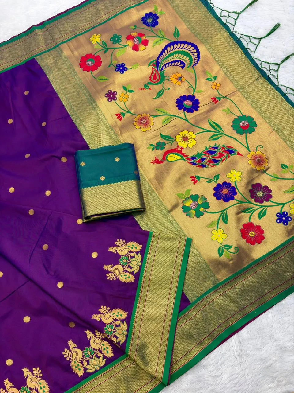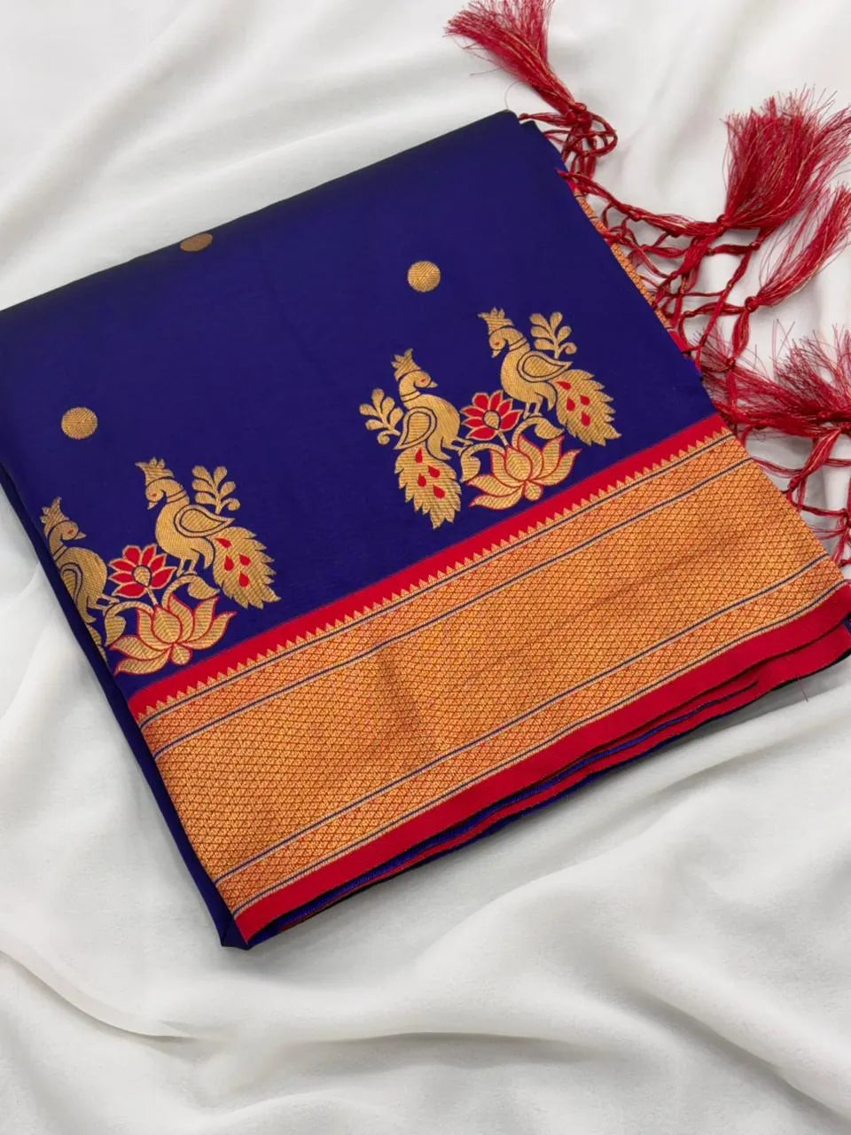 Graceful saree crafted in premium soft silk, designed with polka motifs all over the body for a classic and elegant look. The highlight of this saree is its contrast rich woven traditional original Paithani pallu, beautifully complemented by a contrast traditional peacock panel border, adding a royal and authentic touch.
