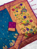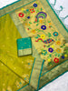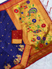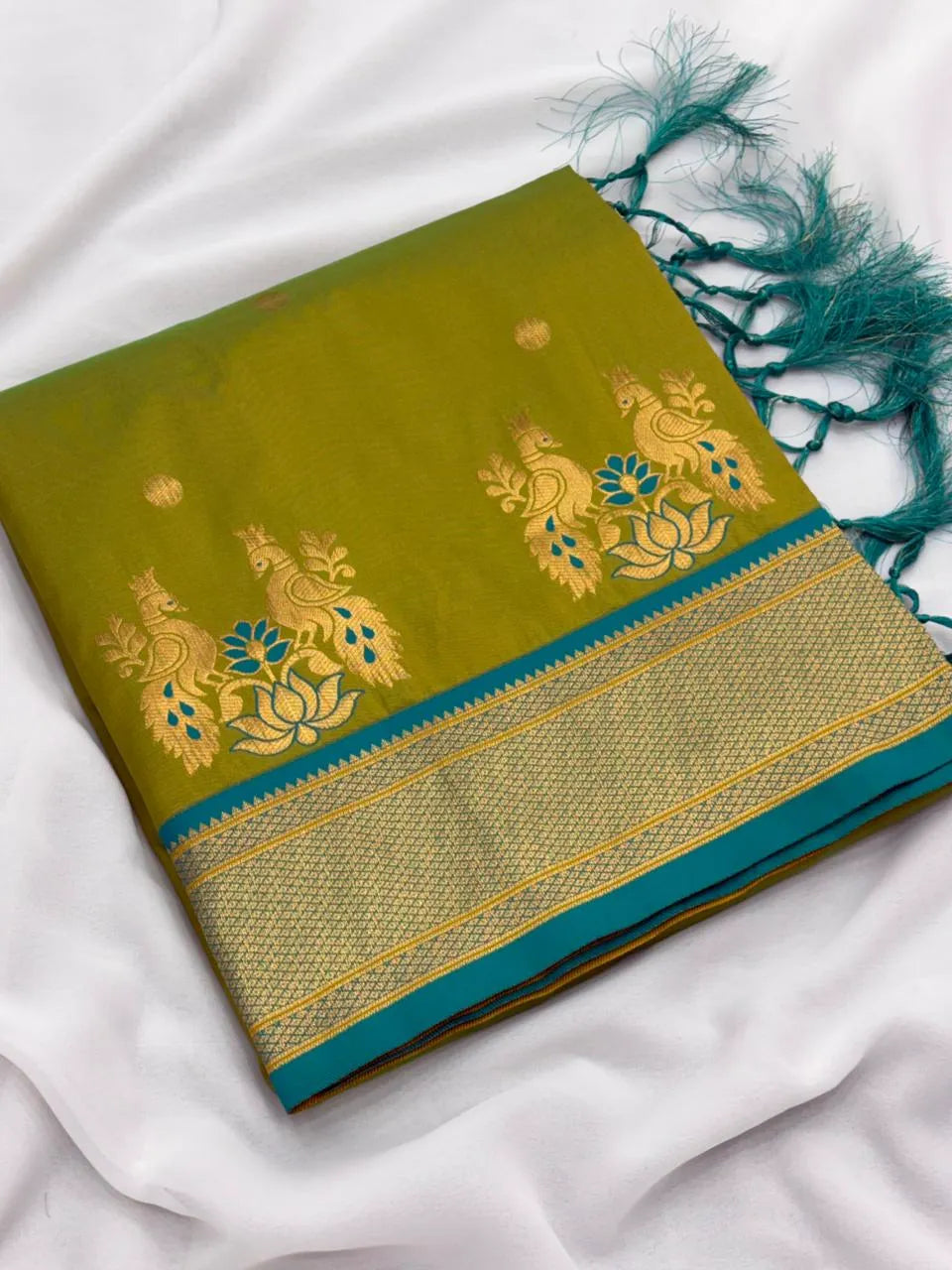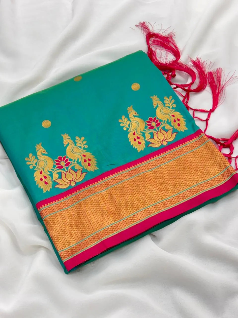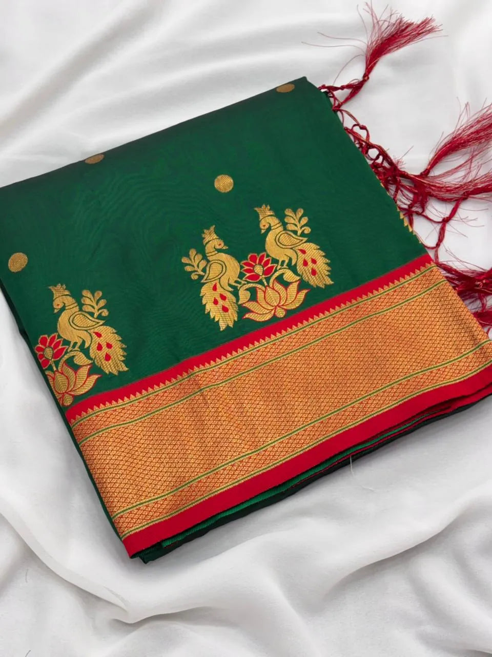 Graceful saree crafted in premium soft silk, designed with polka motifs all over the body for a classic and elegant look. The highlight of this saree is its contrast rich woven traditional original Paithani pallu, beautifully complemented by a contrast traditional peacock panel border, adding a royal and authentic touch.