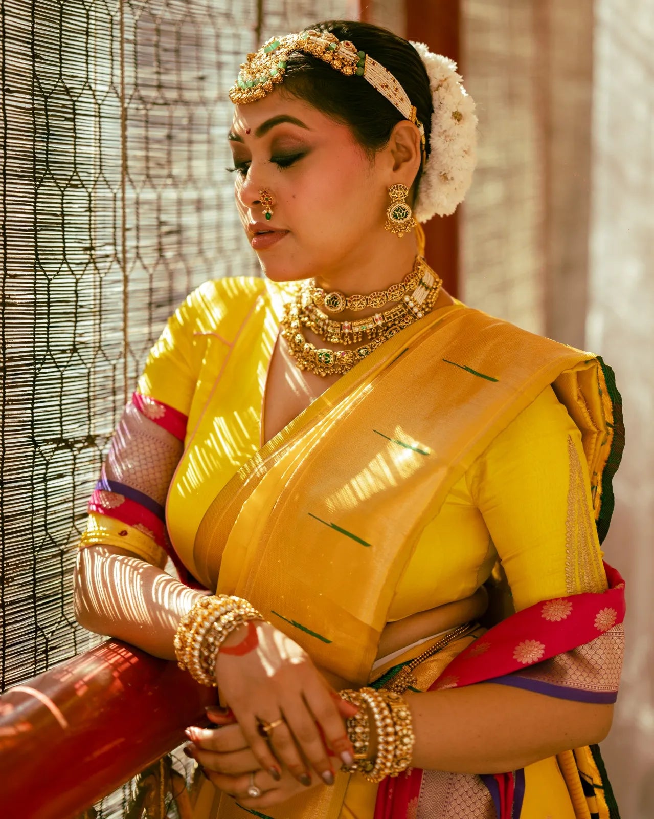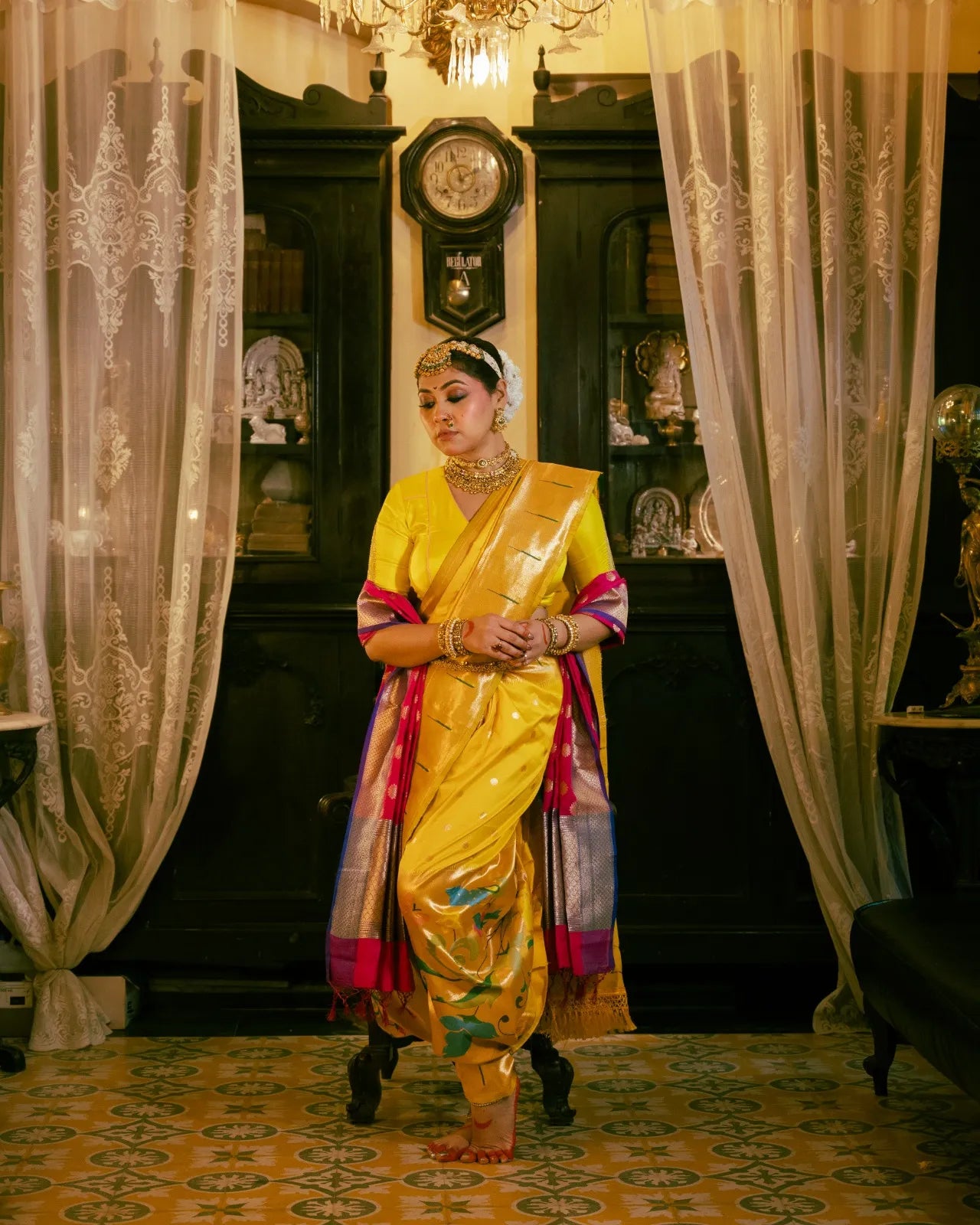 Elevate your ethnic wardrobe with this elegant Mustard Yellow Paithani Silk Saree, crafted to reflect timeless Maharashtrian heritage.