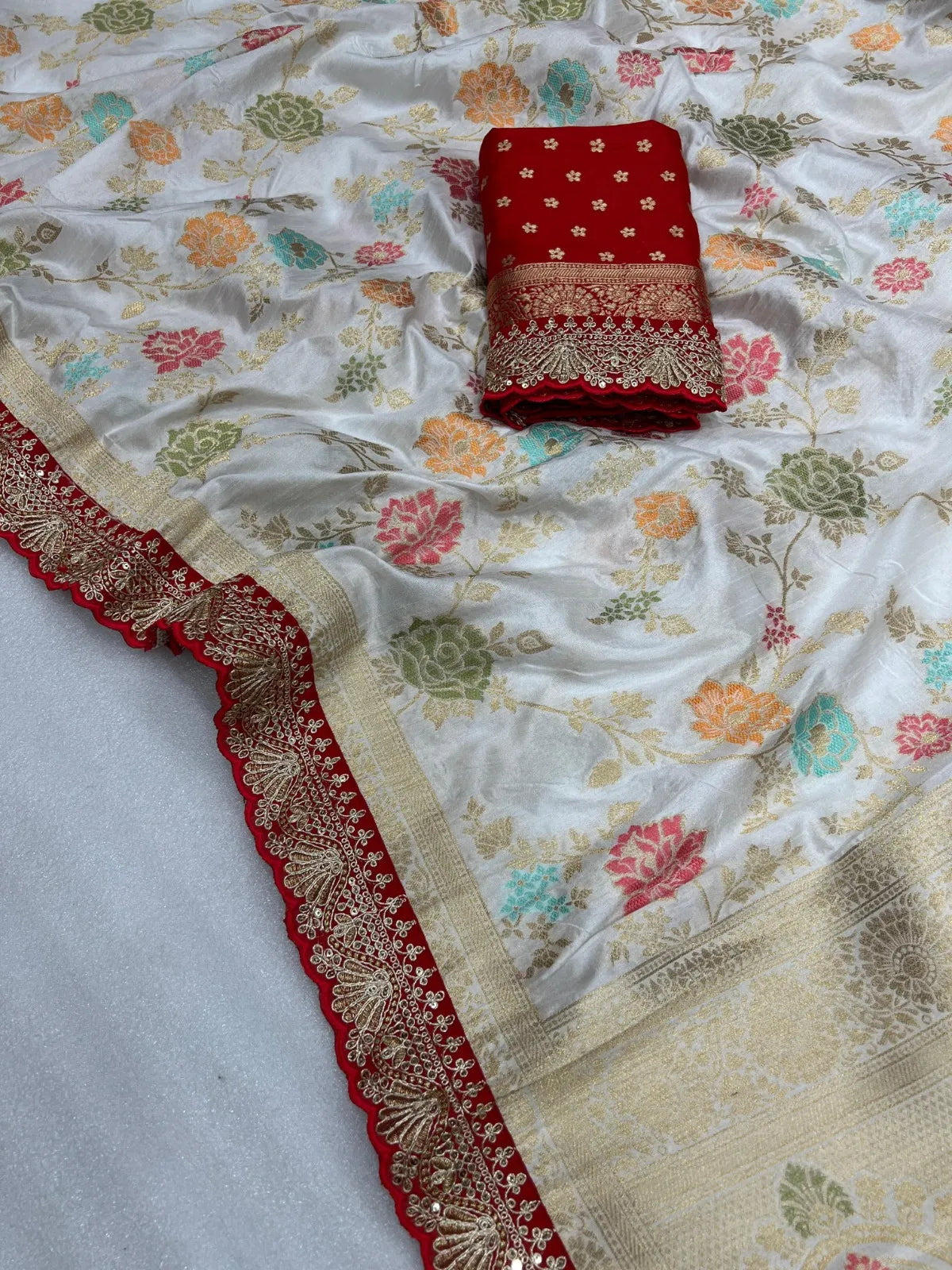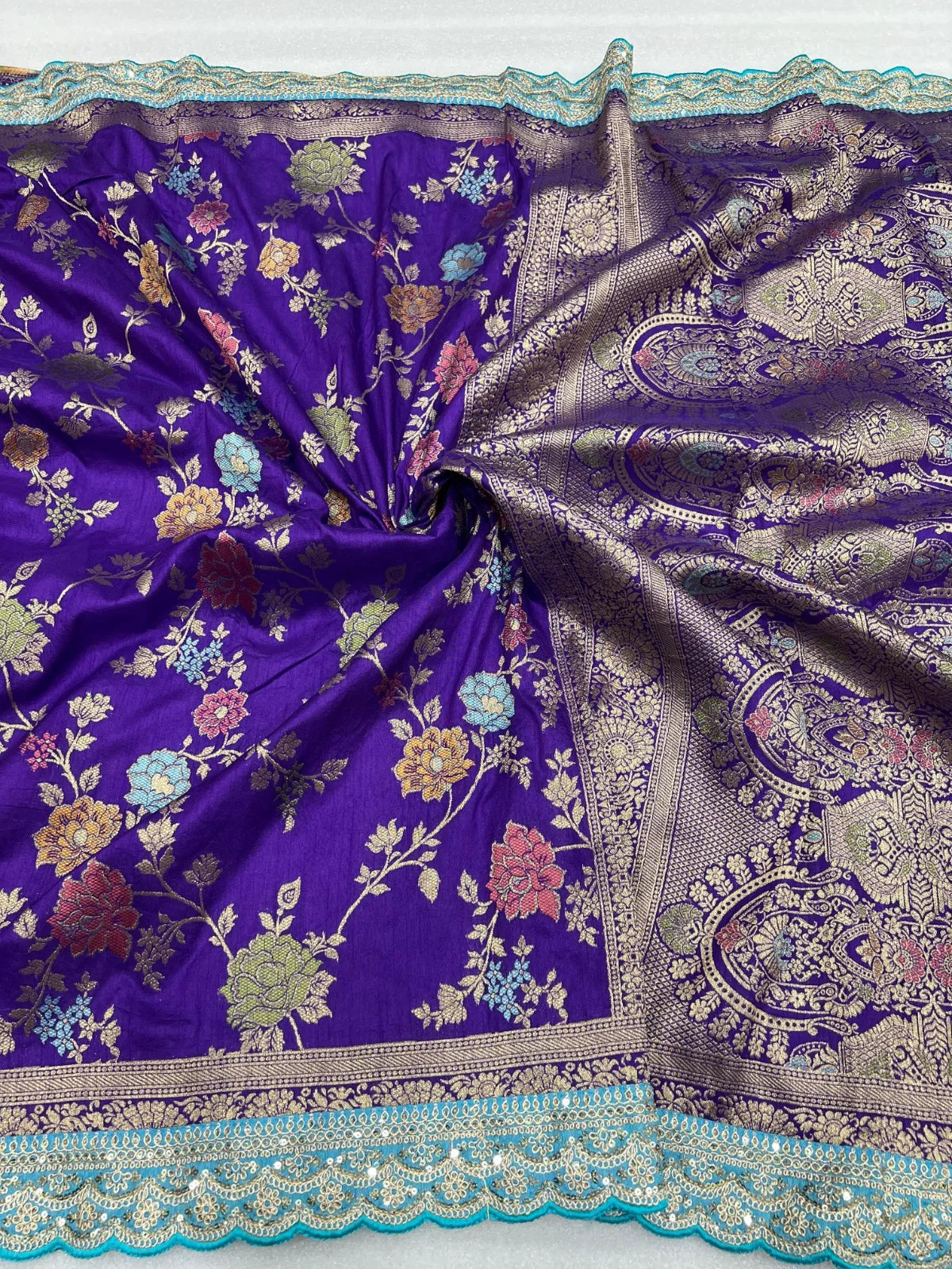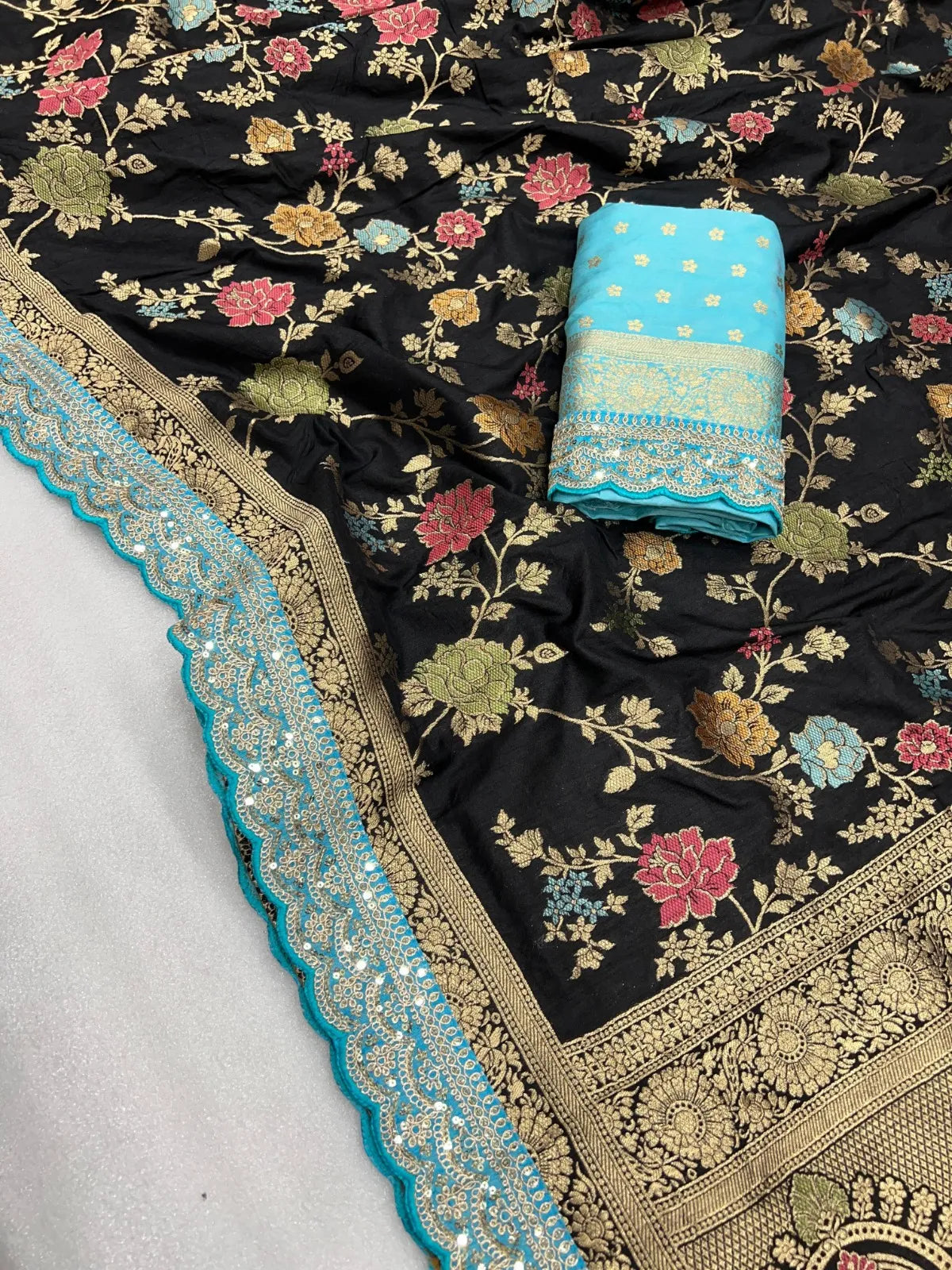 Elevate your festive look with this elegant Dola Silk saree featuring a rich Banarasi lace border. Crafted in soft and flowy fabric, this saree offers a graceful drape with a luxurious finish. The beautifully designed border adds a traditional touch, making it perfect for weddings, festivals, and special occasions.